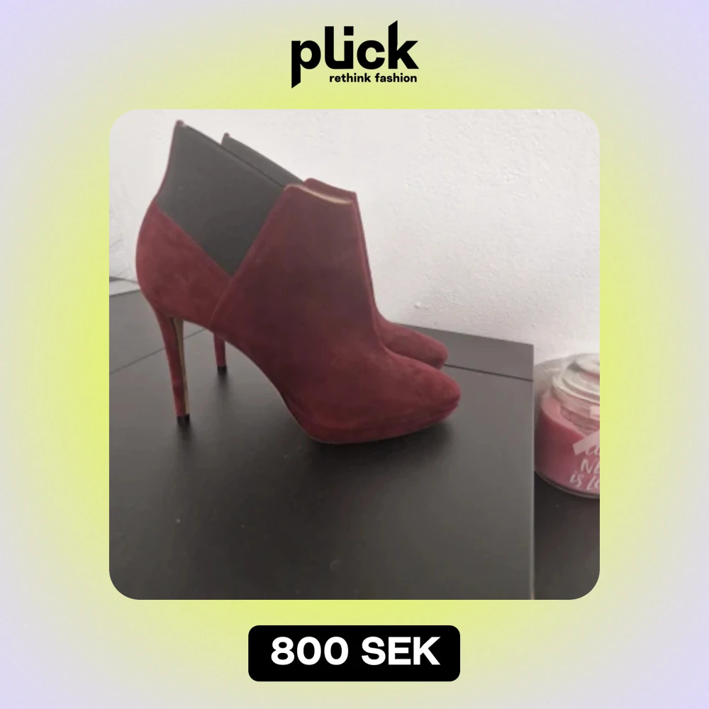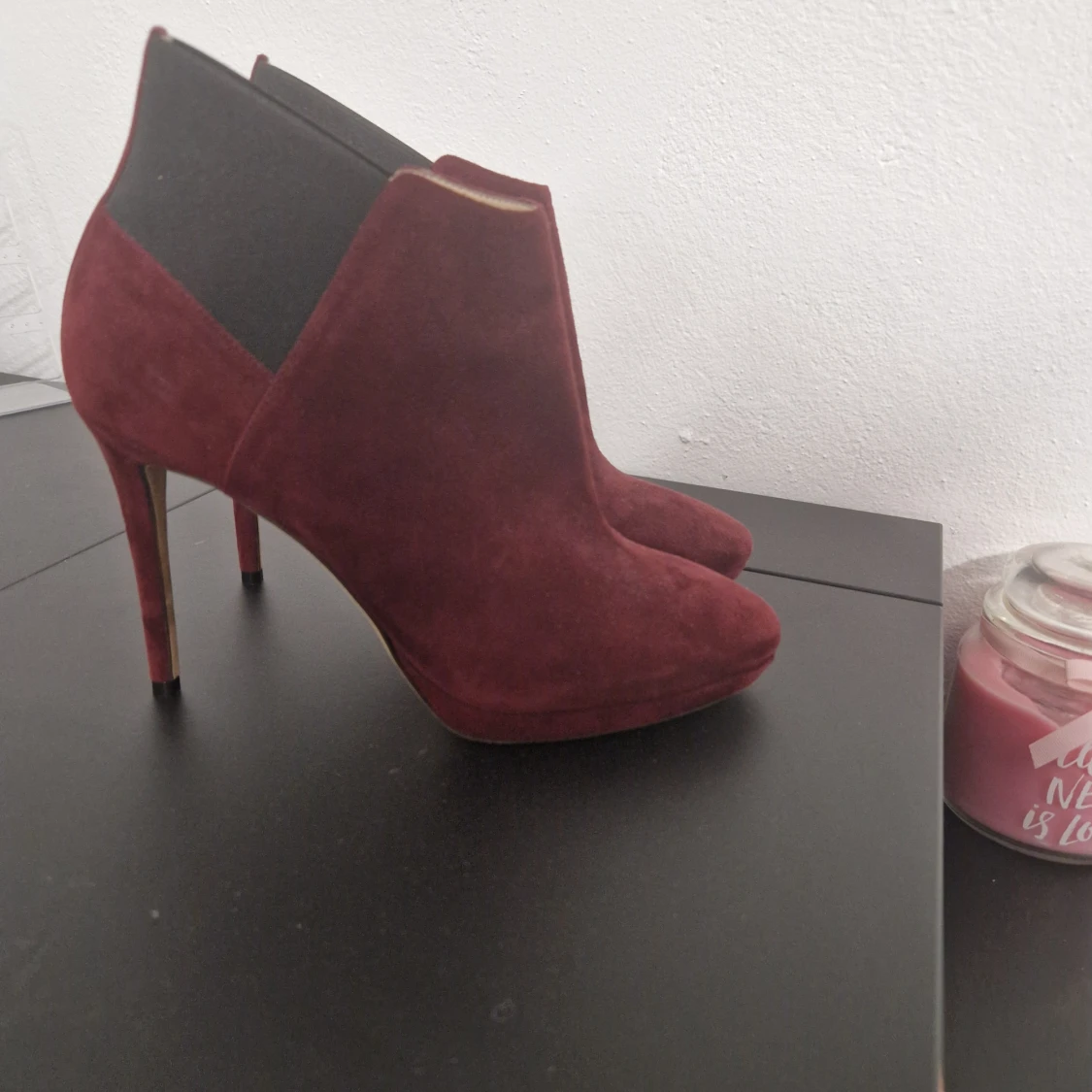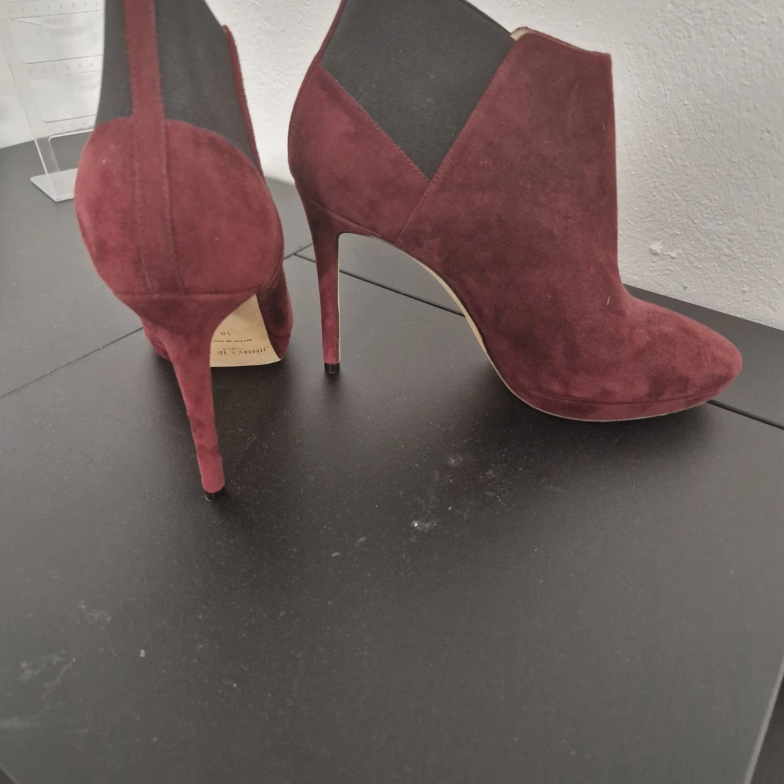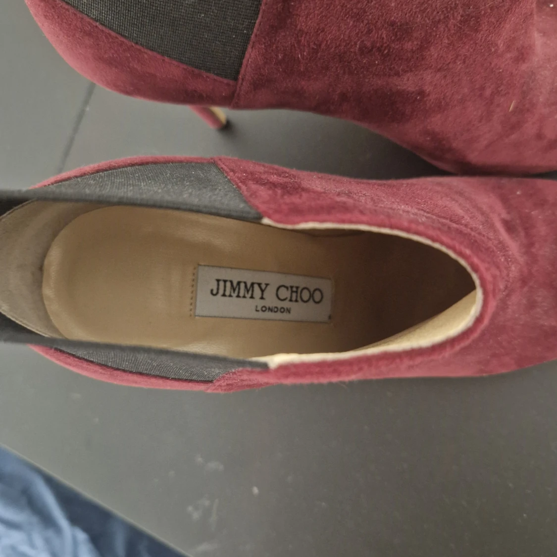 Säljer ett par eleganta vinröda stövletter i mocka från Jimmy Choo. De har en spetsig tå och hög klack, vilket ger en stilren och sofistikerad look. Perfekta för höst och vinter, och passar både till fest och vardag.