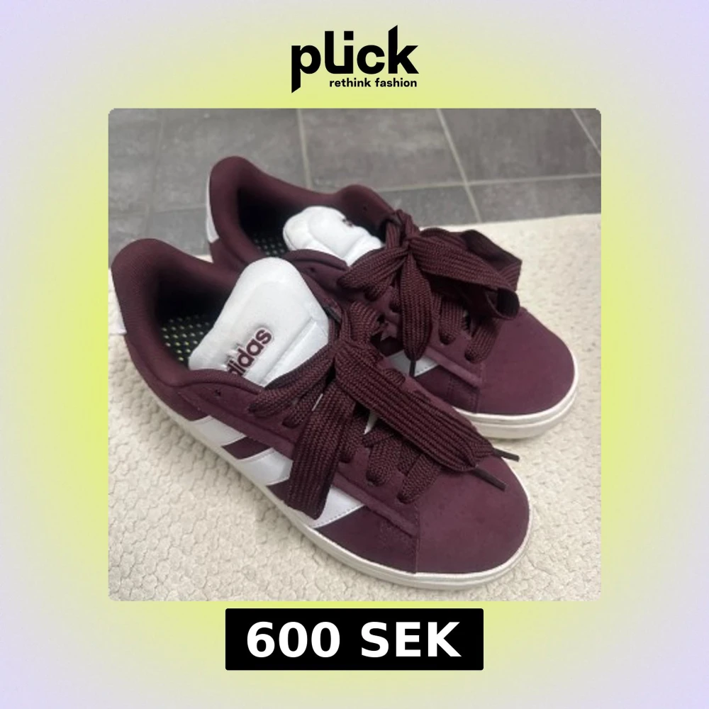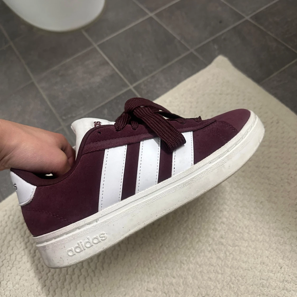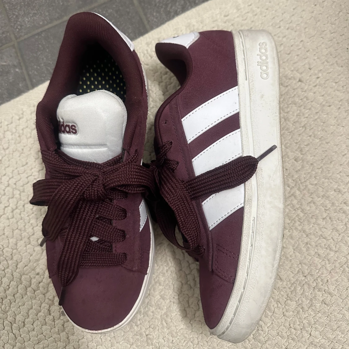Snygga vinröda sneakers från Adidas med vita detaljer och klassiska tre ränder på sidan. Skorna är i väldigt bra skick. Passar mig som är en normal 39