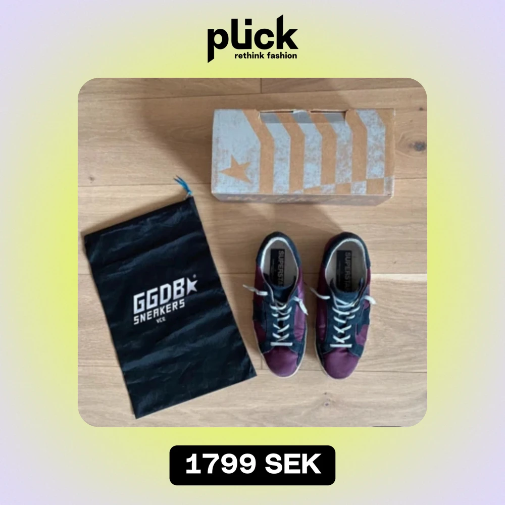 Säljer ett par snygga vinröda sneakers från GGDB. Skorna är i bra skick och har en cool design med svarta detaljer och vita snören. De är perfekta för vardagsbruk och har en bekväm passform. Kommer med originalförpackning och en svart GGDB-påse.