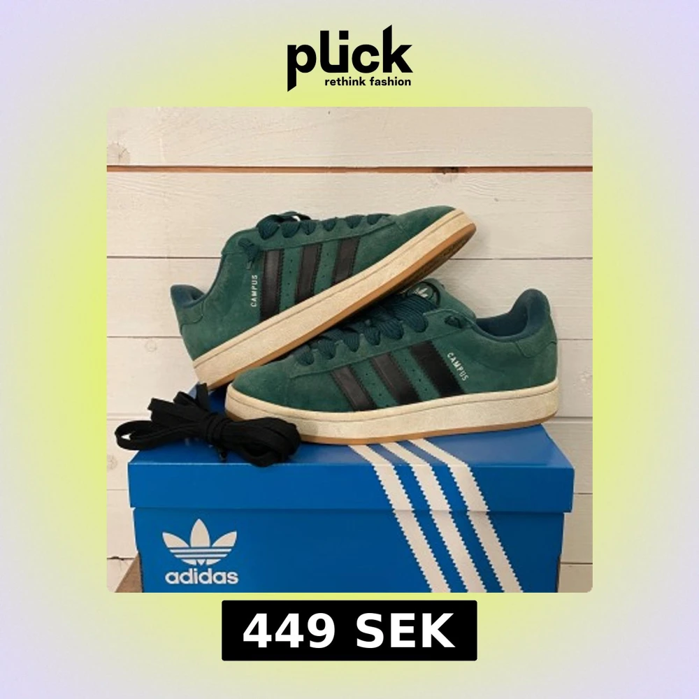 Tja! Säljer dessa Adidas Campus sneakers i mörkgrön mocka. Skorna har snörning och kommer med extra svarta skosnören. Skorna är sparsamt använda med ett slitage på insidan av ena skon, men det är inget som syns vid användning. Hör av dig vid minsta fundering!