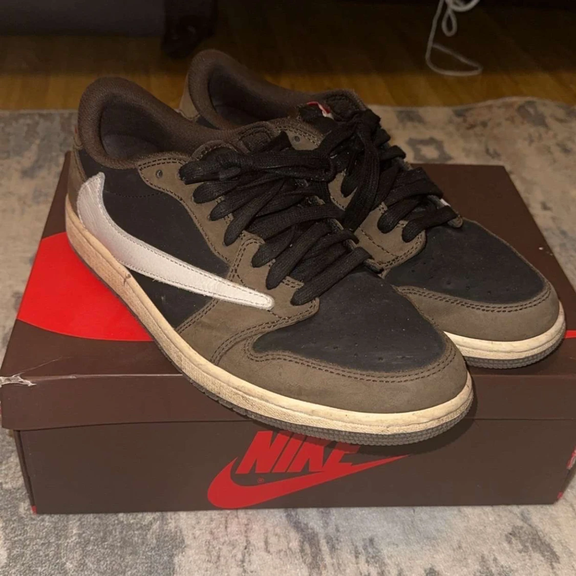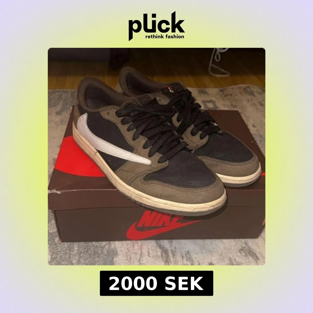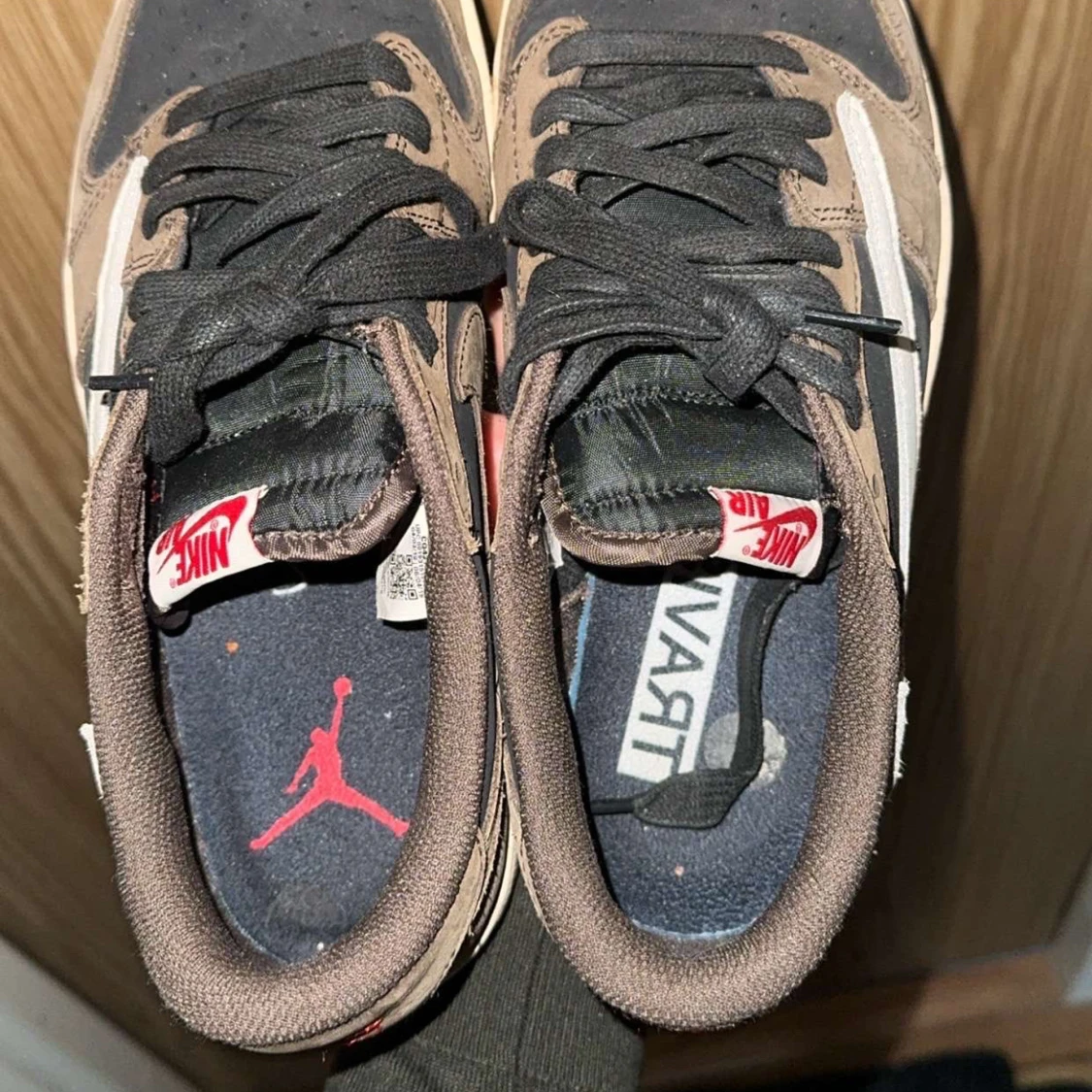 Snygga Nike Air Jordans x Travis Scott i brunt och svart med vita detaljer. Skorna har en klassisk design med snörning och en röd logotyp på hälen. Perfekta för dig som vill ha en stilren look. Skorna är nästan helt nya och endast använda några få gånger!