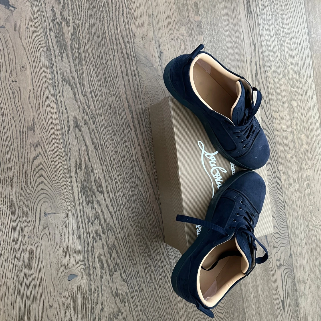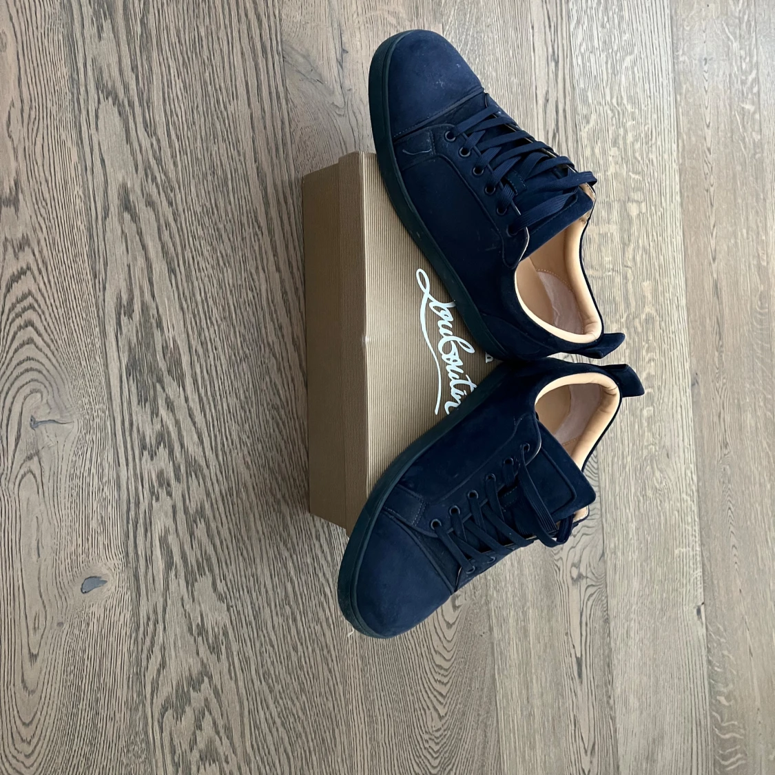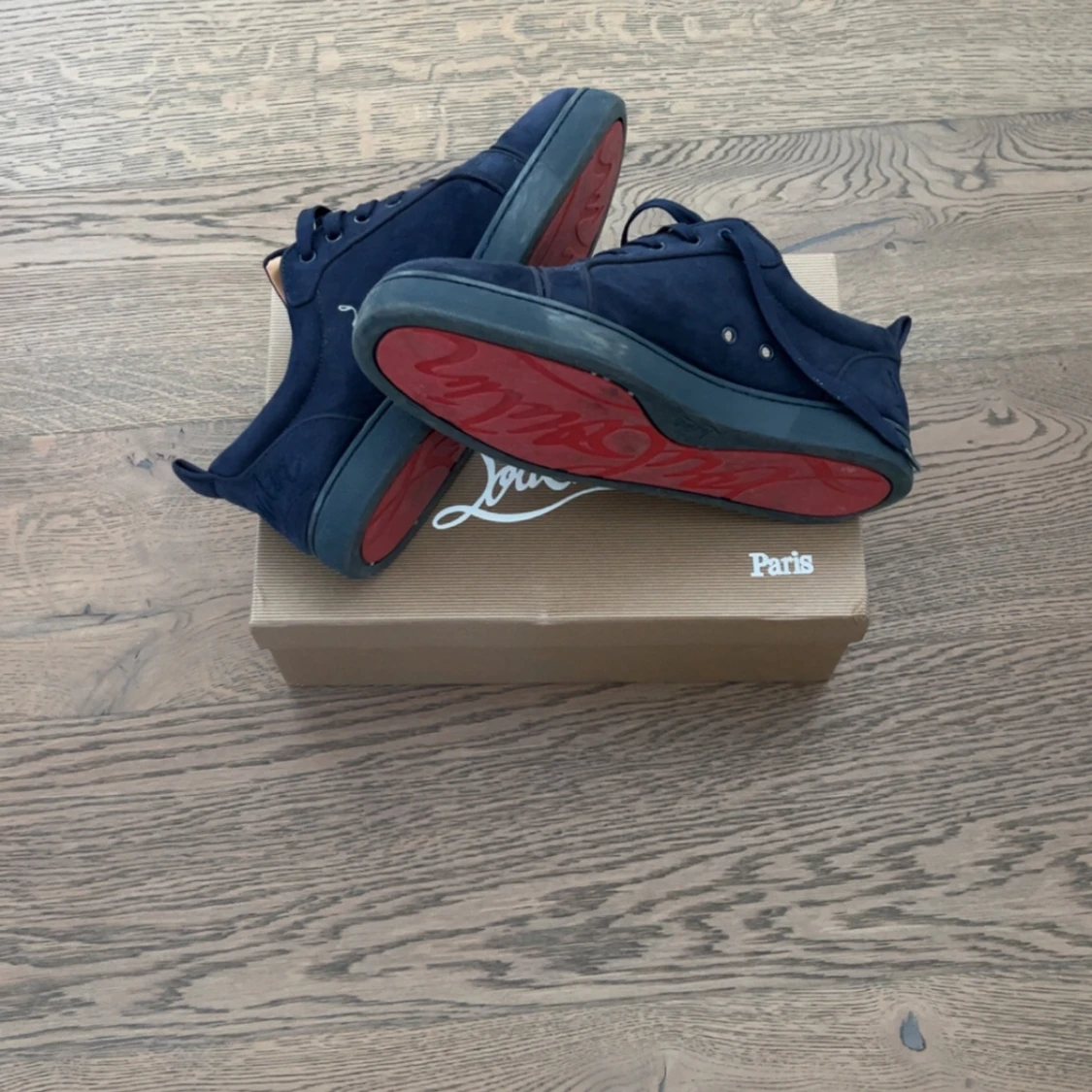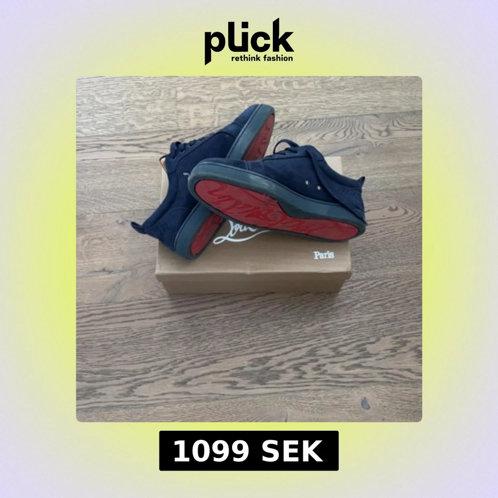 Säljer ett par mörkblå sneakers från Louboutin i mocka med klassisk röd sula. Skorna har snörning och rund tå, samt en stilren design med diskreta detaljer. Perfekta för dig som vill ha något exklusivt och snyggt på fötterna. Dem är använda nästan halva sommaren, man kan lätt tvätta dem så de ser nya ut om man orkar det.