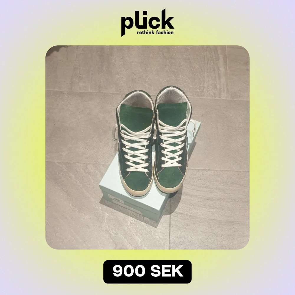 Säljer dessa feta philippe model då de inte passar mig. Storleken är 42 men passar 43 Dessa är perfäkta till vintern då de är höga och lätt fodrade! Sckiket skulle jag säga är 8/10 då färg har åkt av på hälen, som visas på bilden samt en spricka i sulan. Box ingår ej