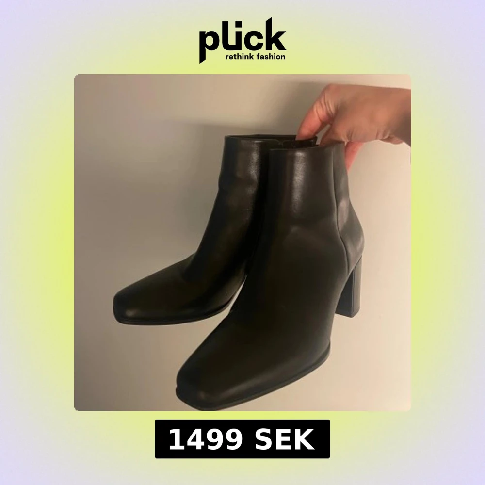 Snygga svarta boots med hög klackTillverkade i slätt skinn med minimalistisk design och diskret dragkedja på sidan. Perfekta för dig som gillar stilrena boots med lite edge. De är mjuka, fina och bekväma. Användes ett fåtal gånger, i bra skick. Nypris 2000 kr
