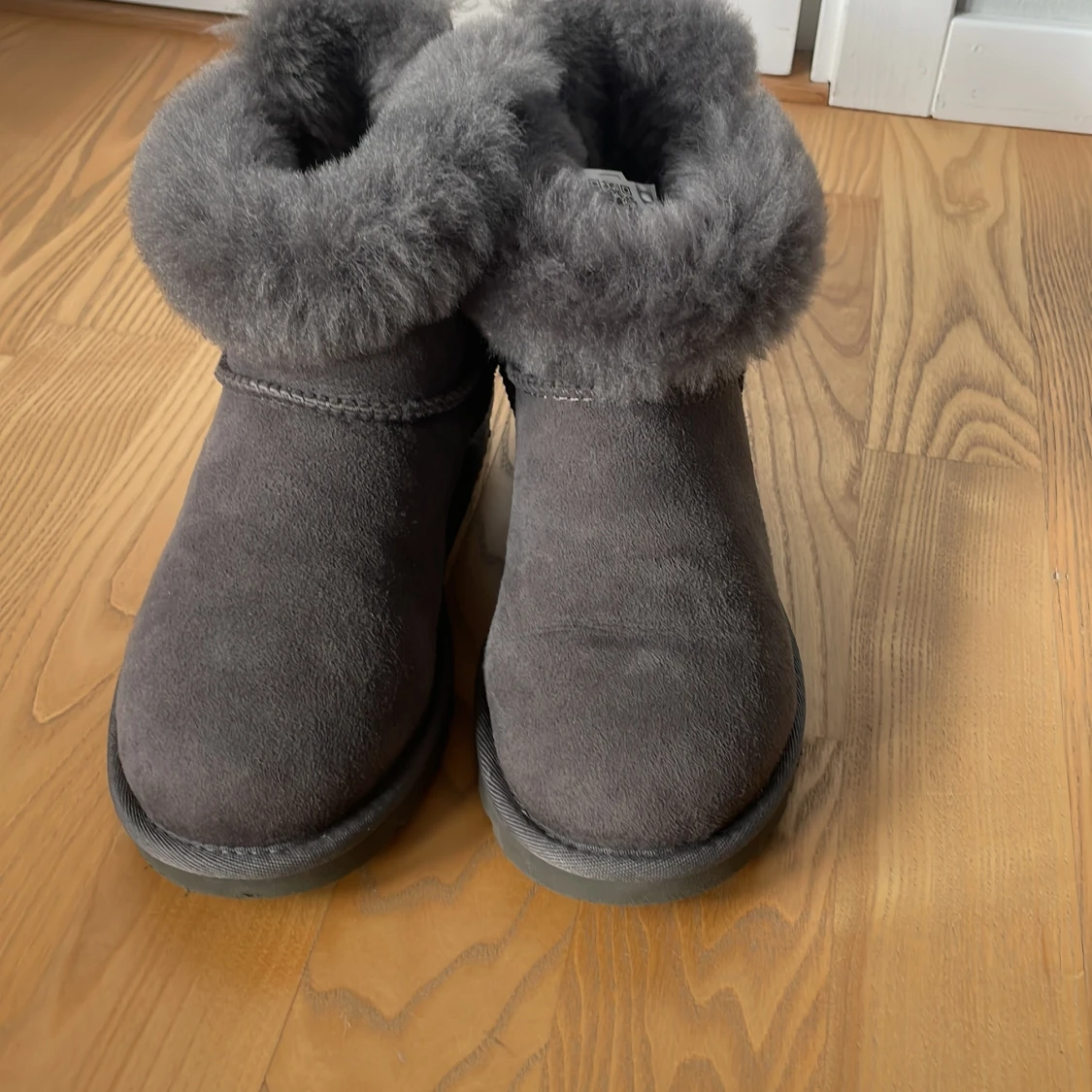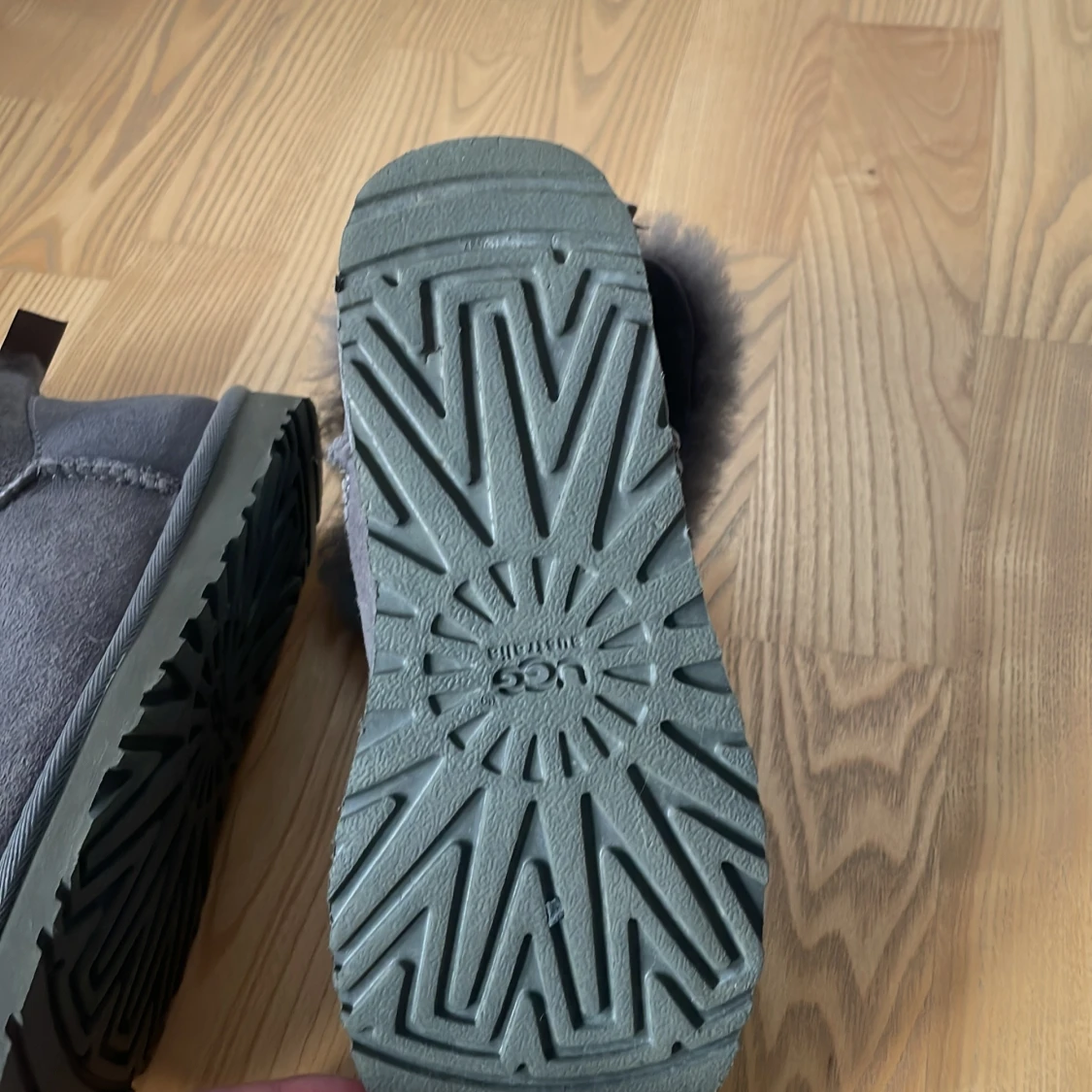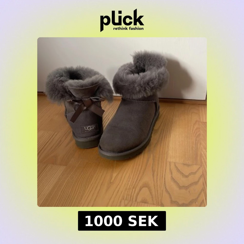 Mysiga grå UGG boots med fluffig päls runt skaftet och en söt rosett bak. Skorna är i mocka och har en platt sula med grovt mönster för bra grepp. Perfekta för kalla dagar när du vill hålla fötterna varma och snygga.skorna är köpta i Australien och är typ helt oanvända.