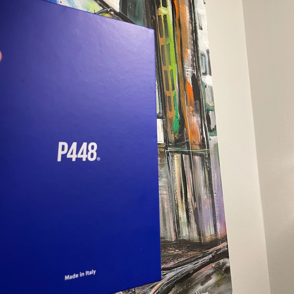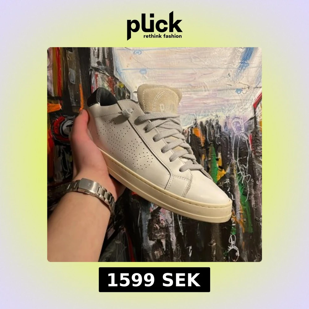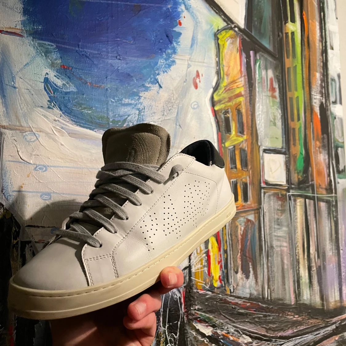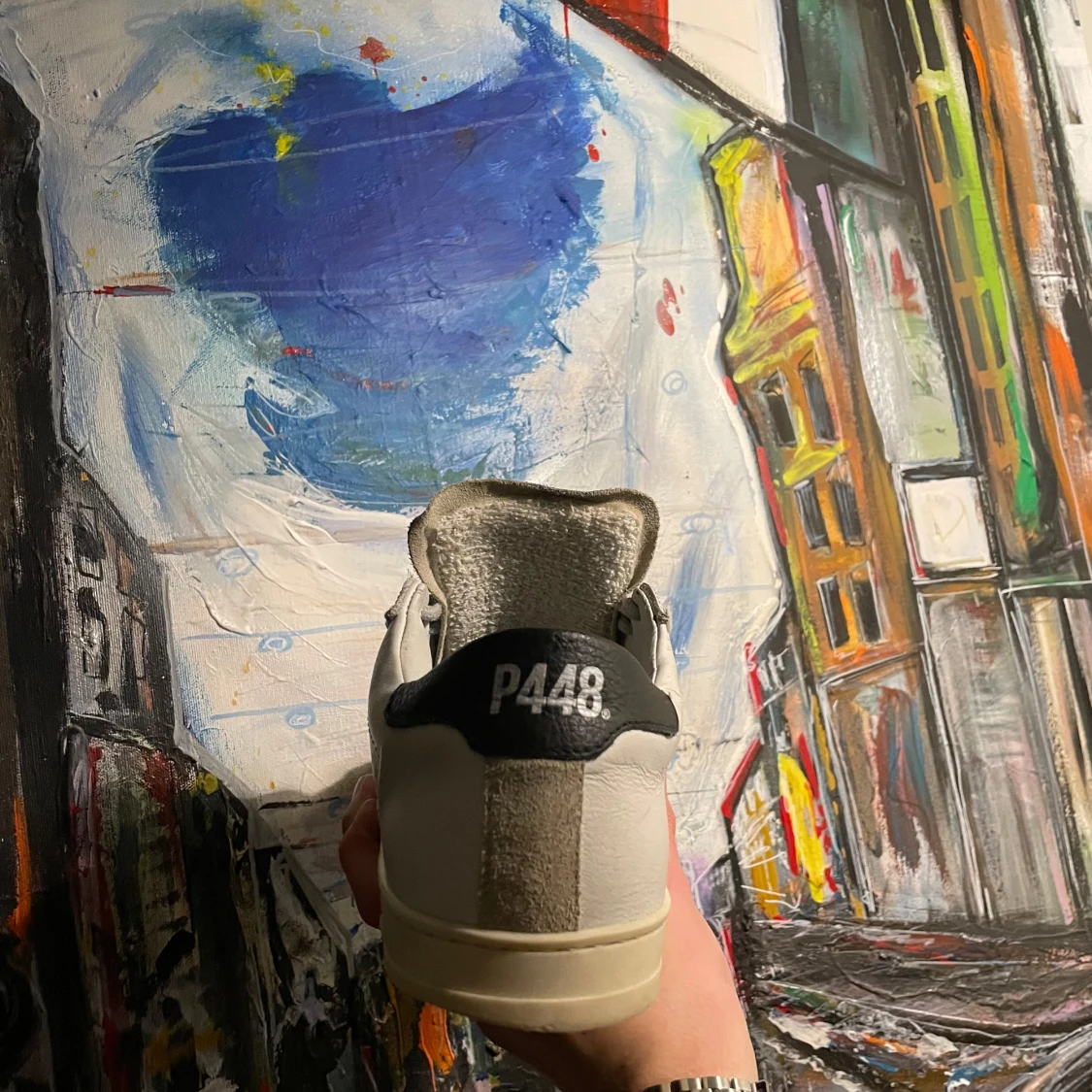 Snygga vita sneakers från P448 med perforerade detaljer och grå snörning. Skorna har en svart hälflik och är tillverkade i Italien. Perfekta för en stilren look.