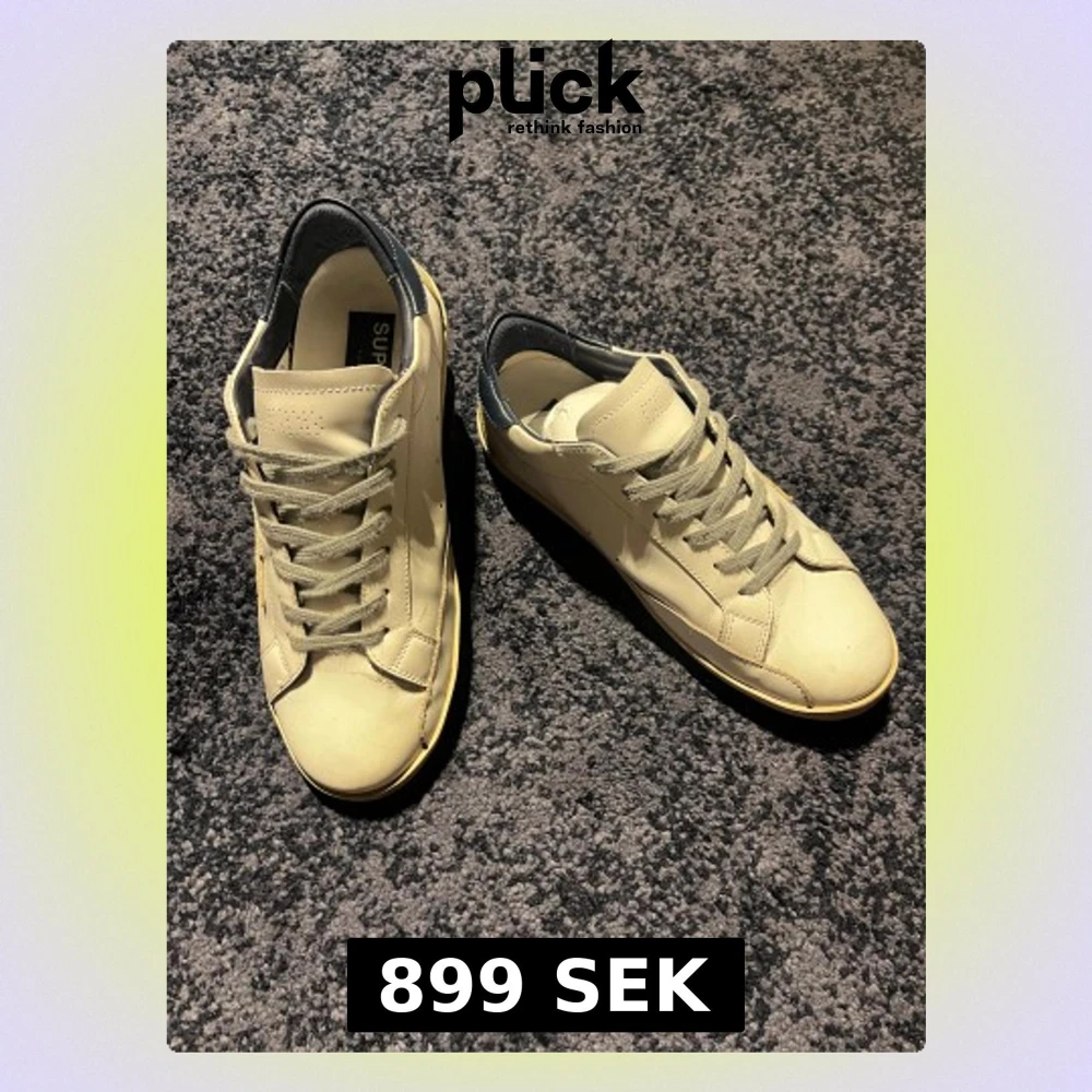 Snygga sneakers i beige skinn med kontrasterande mörkblå häl och beige mockadetaljer. Sidan pryds av en stor stjärna i mocka och skorna har rund tå, platt sula och snörning. Perfekt för dig som gillar klassisk stil med en twist. Skorna har vissa defekter såsom slitage på sulan och vid sidan på skon. Har alltså använts flitigt men hyfsat varsamt. Storlek 43. Kontakta vid frågor och funderingar pris ej hugget i sten
