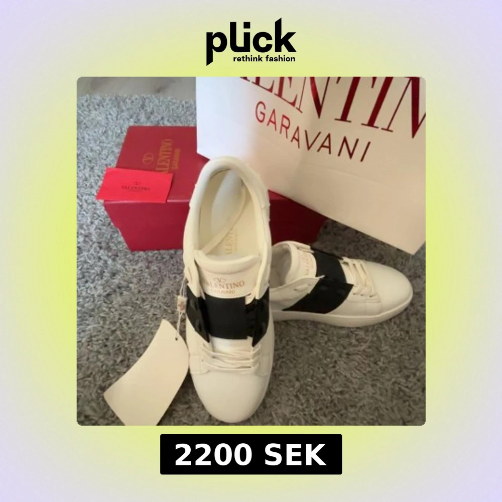 Säljer ett par snygga Valentino Garavani Open sneakers i vitt skinn med bred svart rem över mitten. Klassisk rund tå, platt sula med nitar och vita snören. Märkeslogga på plösen och cool kontrast mellan färgerna. Perfekta för dig som gillar exklusiv streetstyle.