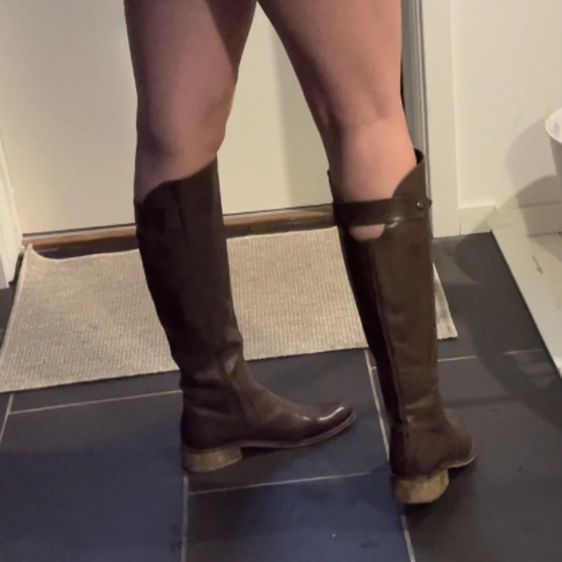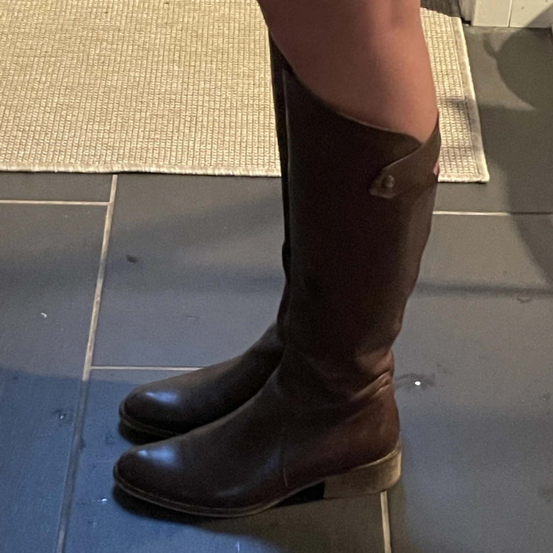 Bruna stövlar med låg klack. Hål på baksidan längst upp på skon som man ser på andra bilden. Använda men fina! Skriv privat för fler bilder😊