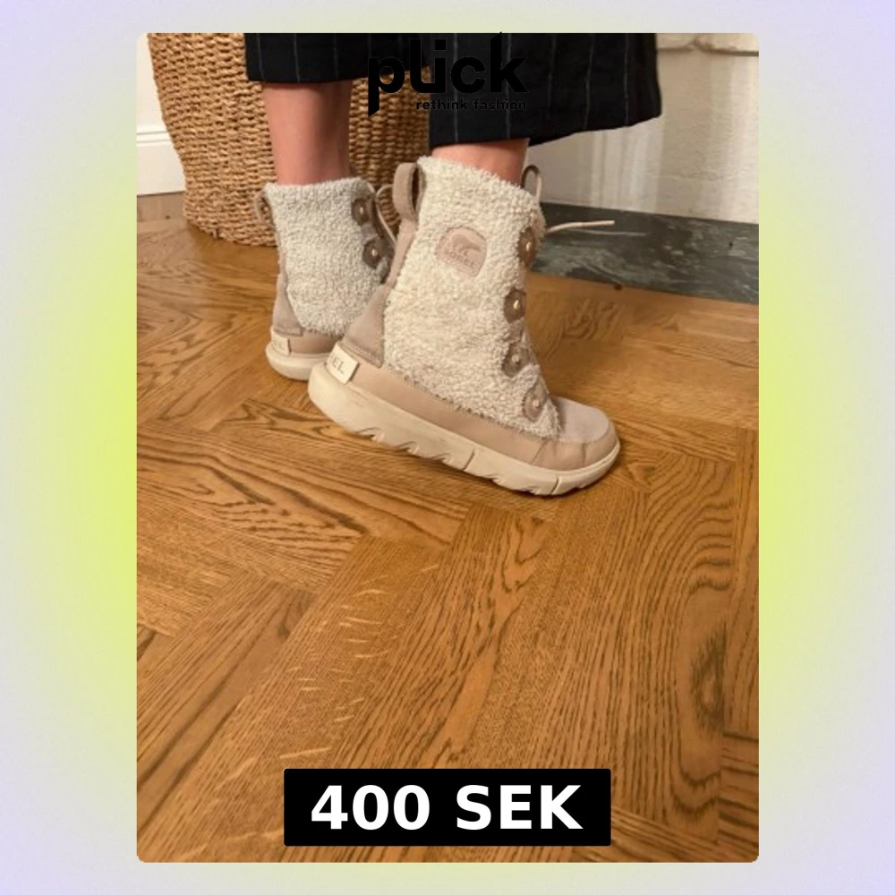 Säljer ett par beige vinterboots från Sorel med mysigt teddyfoder och detaljer i mocka. Skorna har snörning framtill, grov sula och rund tå. Perfekta för kalla dagar och ger en riktigt chill vinterlook.