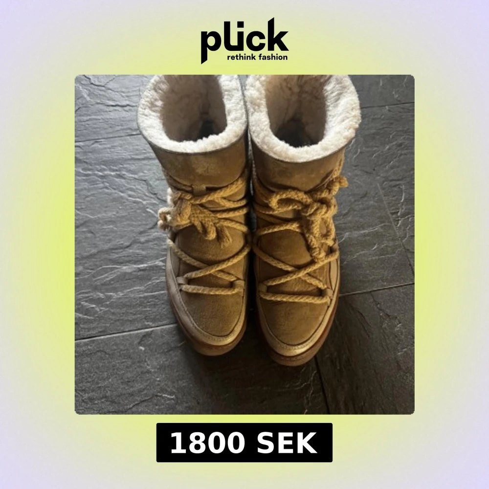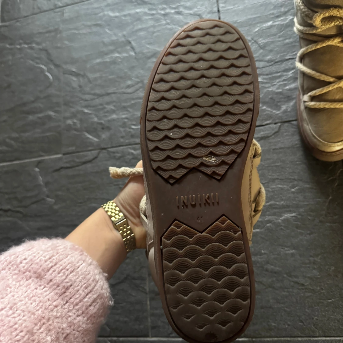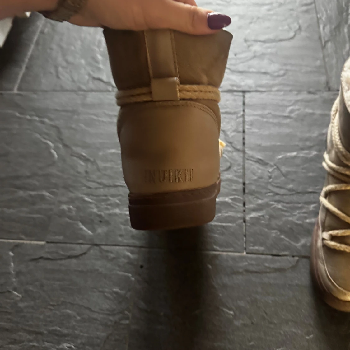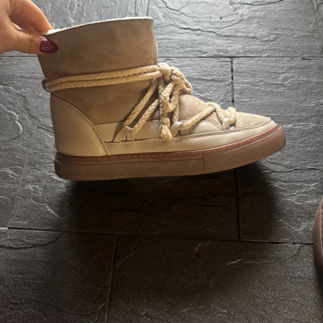 Säljer ett par beige boots från Inuikii med grov snörning och mysigt foder. Skorna har en platt sula, rund tå och är tillverkade i mocka och skinn. Perfekta för kalla dagar med sin varma insida och snygga design.