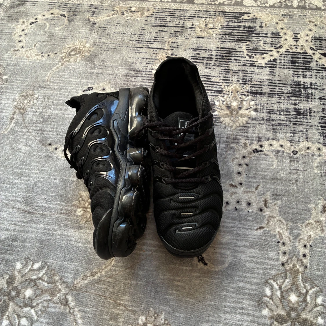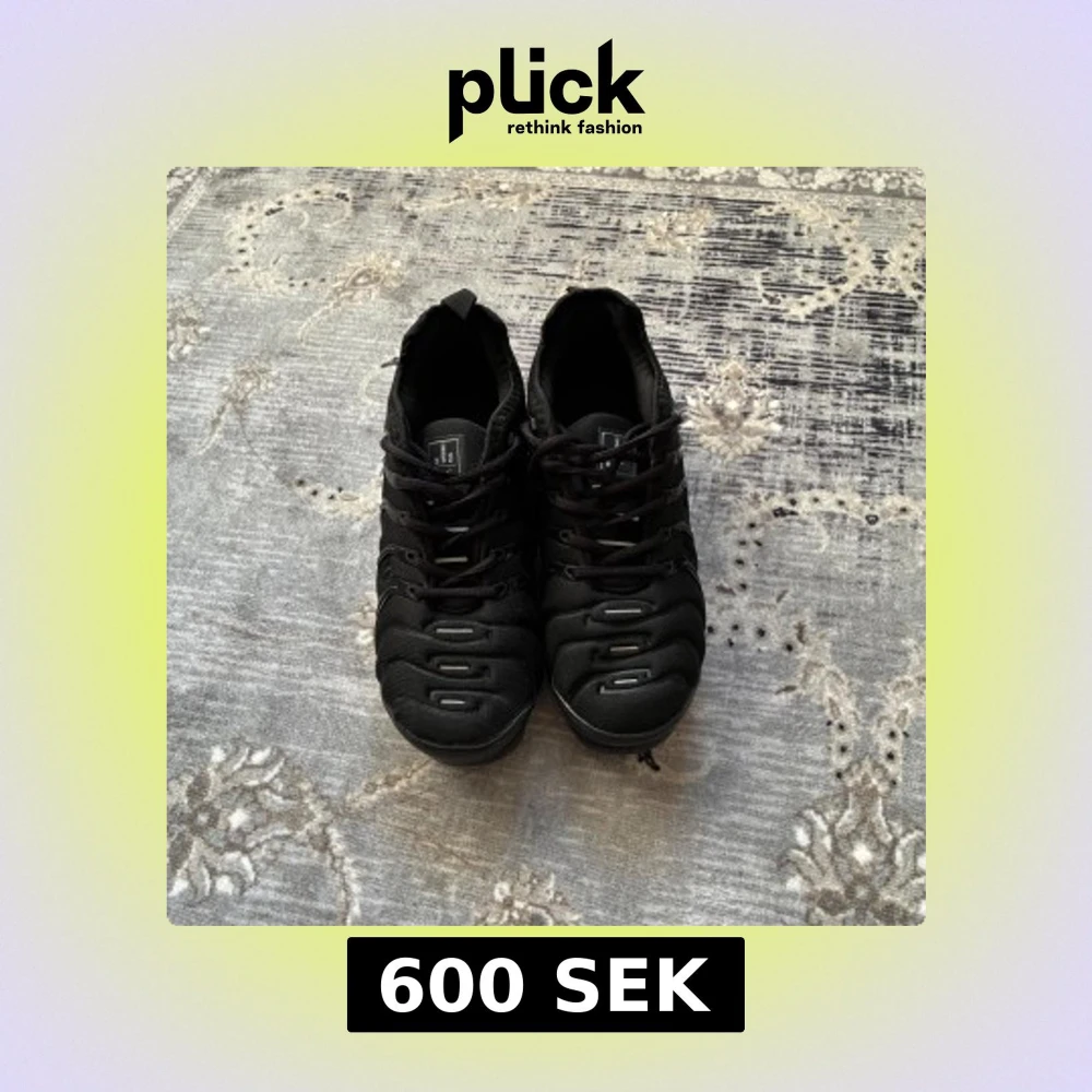 Säljer ett par helsvarta sneakers Nike vapormax med unik, vågig sula och snörning. Skorna har rund tå och platt sula, samt detaljer i syntetmaterial. Perfekta för dig som gillar en modern och sportig look.