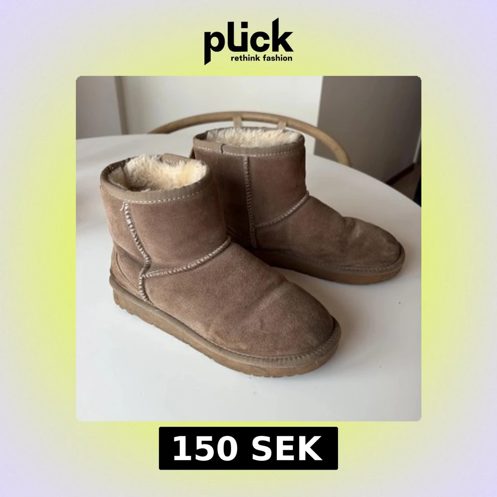 Mysiga boots i beige mocka med rund tå och platt sula. Insidan är fodrad med mjuk, ljus päls som håller fötterna varma. Snygga sömmar och enkel design gör dem perfekta för kalla dagar. Använda en vinter, därav lågt pris! Varma och sköna