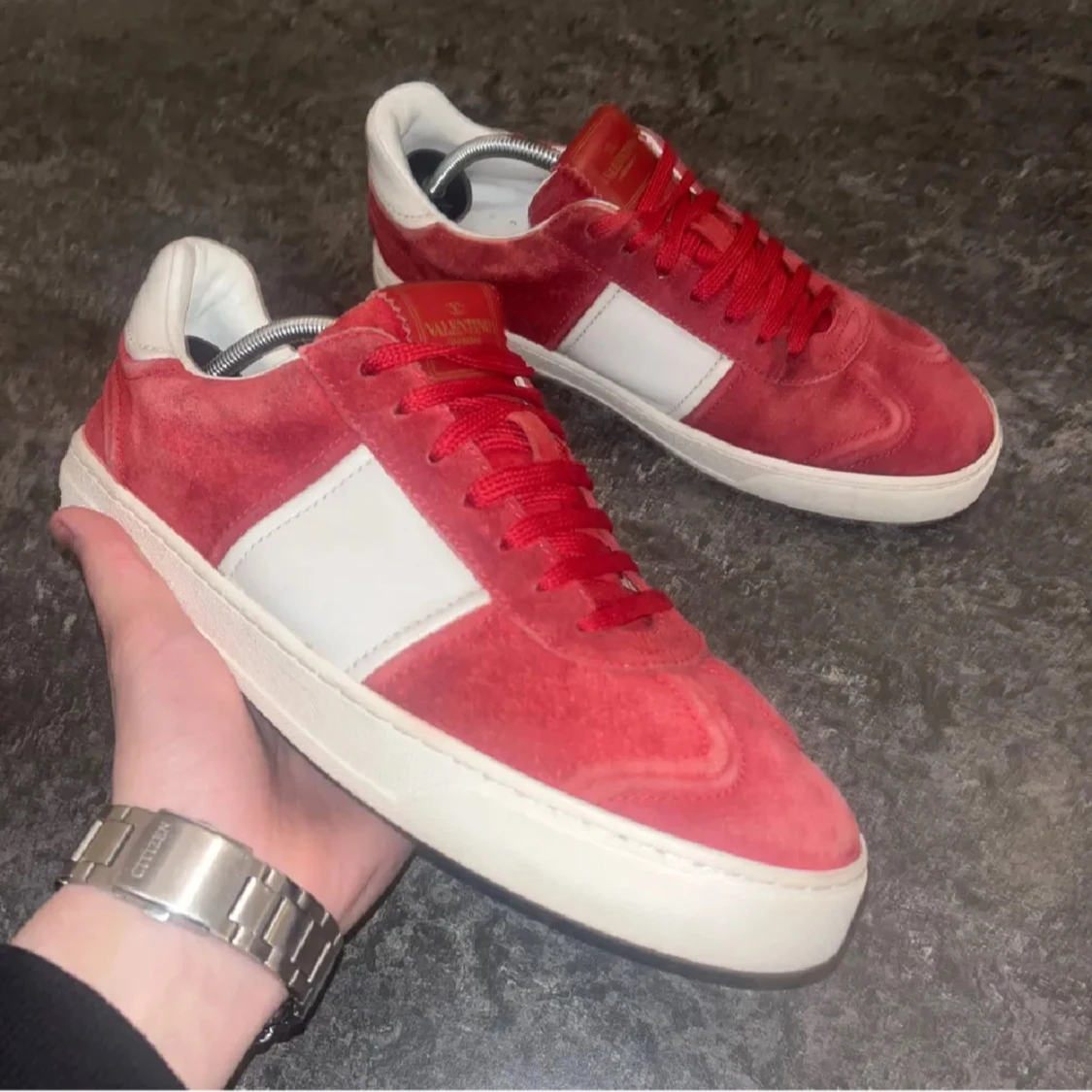 Tja! Säljer nu dessa röda valentino flycrews, storlek 42,5 men passar 42-43. Grymt skick, nästintill nyskick inga defekter. 2 nitar saknas men går att fixa enkelt. Skriv vid minsta lilla fundering!