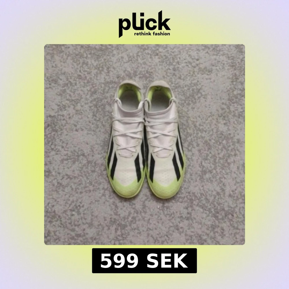 Snygga Adidas fotbollsskor i vitt med neongröna och svarta detaljer. Skorna har snörning och en modern design som passar perfekt för inomhus. Nypris 1200. Denna storleken är väldigt stor efterfrågan och detta är slut i överallt. Vi kan diskutera om priset.