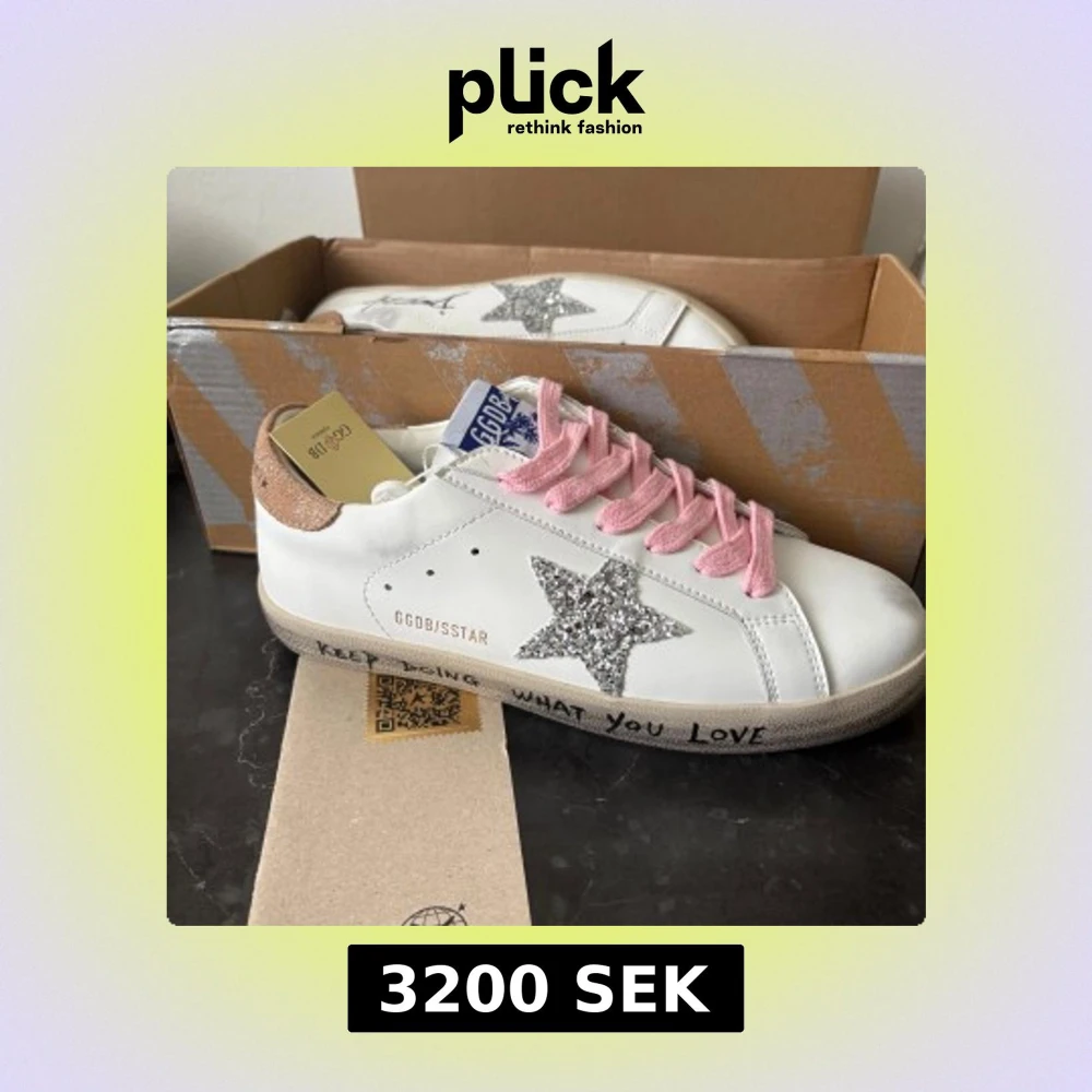 Säljer ett par vita sneakers från Golden Goose med glittrig silverstjärna på sidan, rosa skosnören och beige hälparti. Skorna har rund tå och platt sula. Perfekta för dig som vill ha en unik och trendig look.