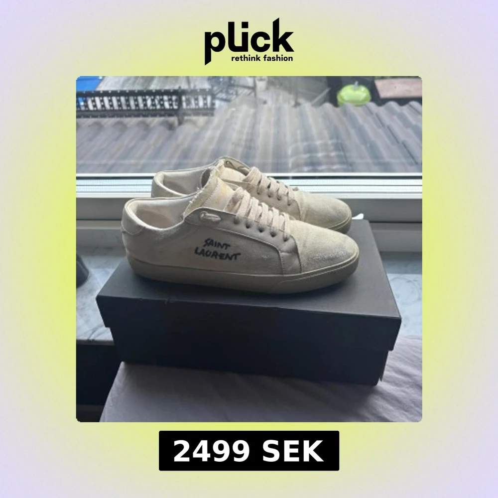 Snygga vita sneakers från Saint Laurent i canvas med broderad logga på sidan. Skorna har rund tå, platt sula och klassisk snörning. Perfekta för dig som gillar stilren och minimalistisk design med exklusiv känsla. Riktigt bra skick 9-10! Pris kan diskuteras vid snabb affär. Äktihetsbevis finns🙌