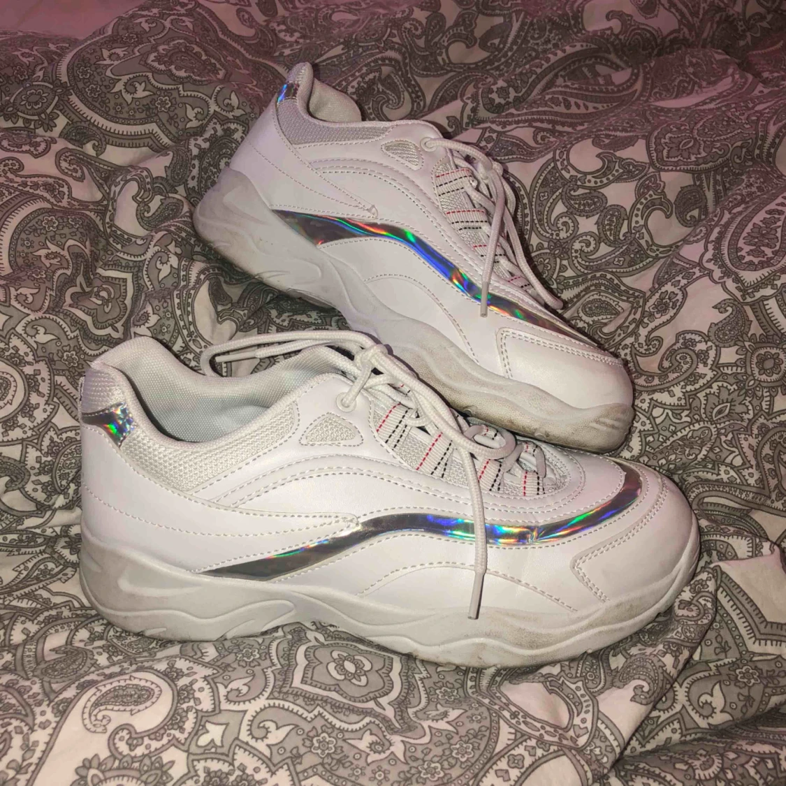 säljer ett par vita chunky shoes med en ascool silverdetalj! använda en gång bara så JÄTTE bra skick! strl är även stor! dem är köpta i spanien för 2 v sedan och jag själv har strl 39/40 och dessa passar mig!