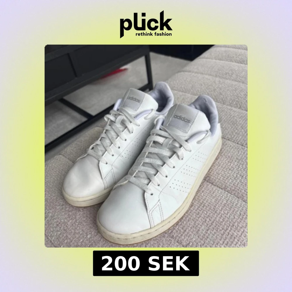 Klassiska vita Adidas sneakers i skinn med diskreta perforerade ränder på sidorna och ljusgrå detalj vid hälen. Skorna har snörning och en platt sula, perfekt för en clean och stilren look. Adidas-logga syns på tunga och häl.