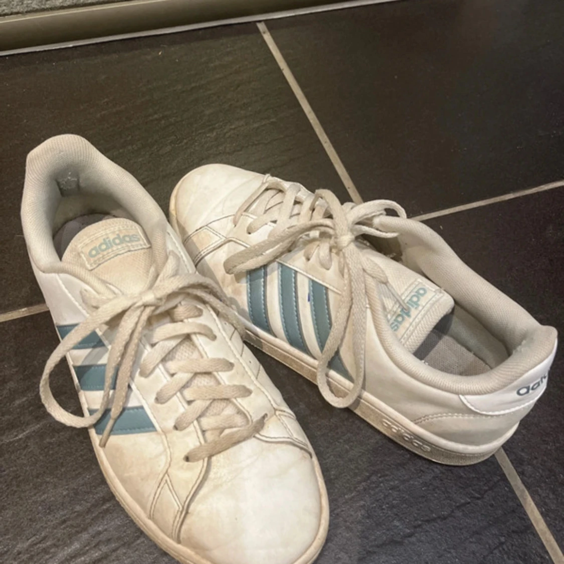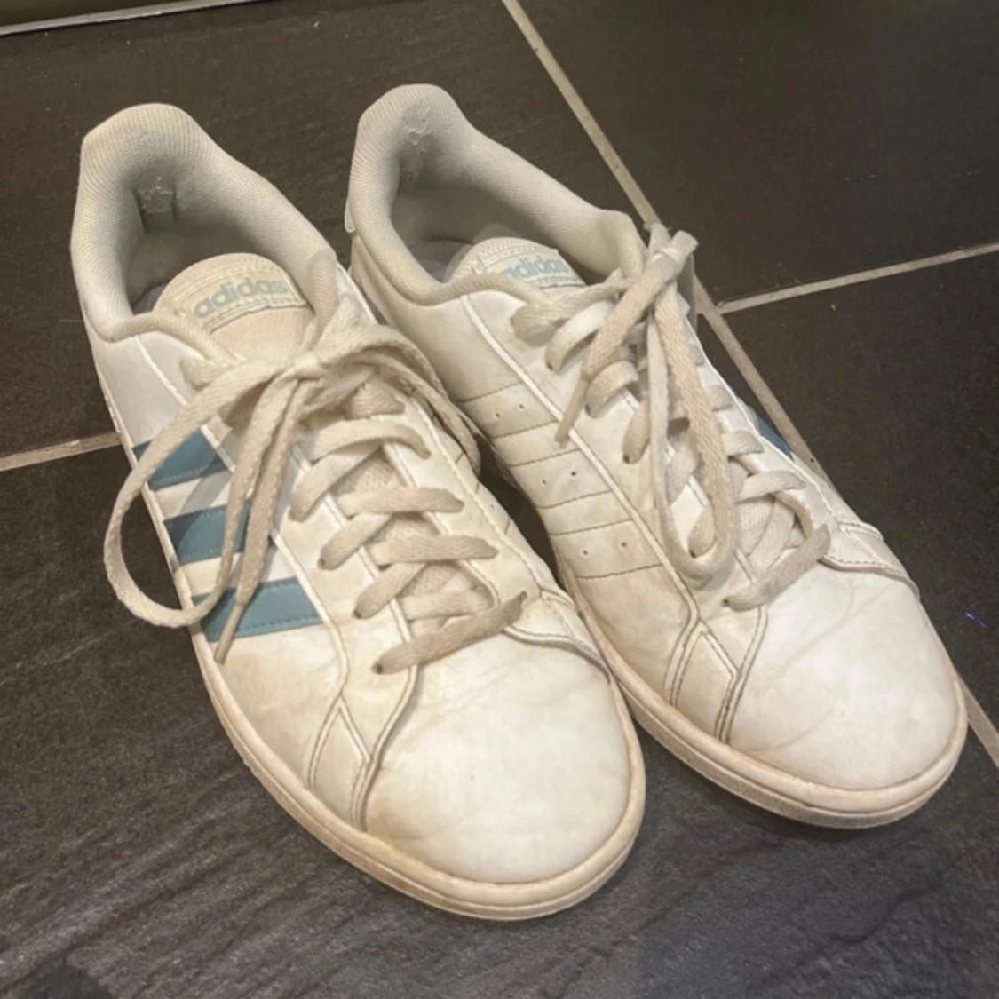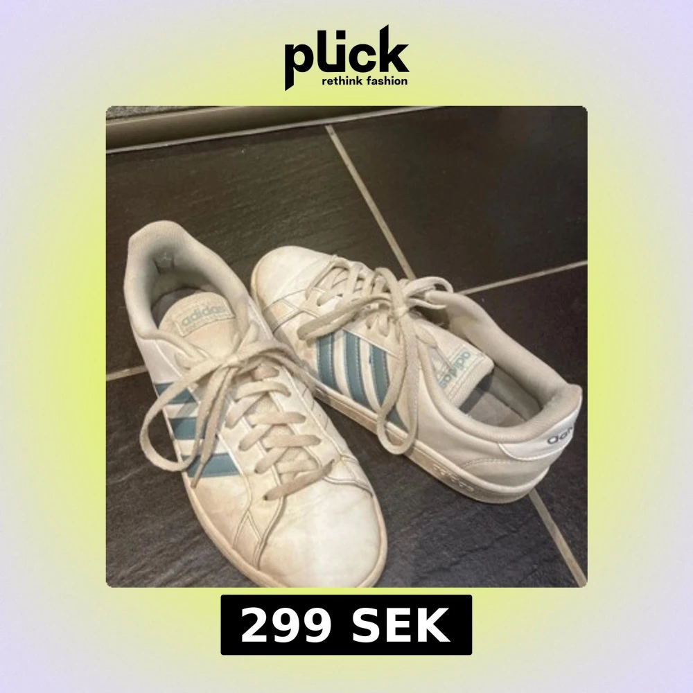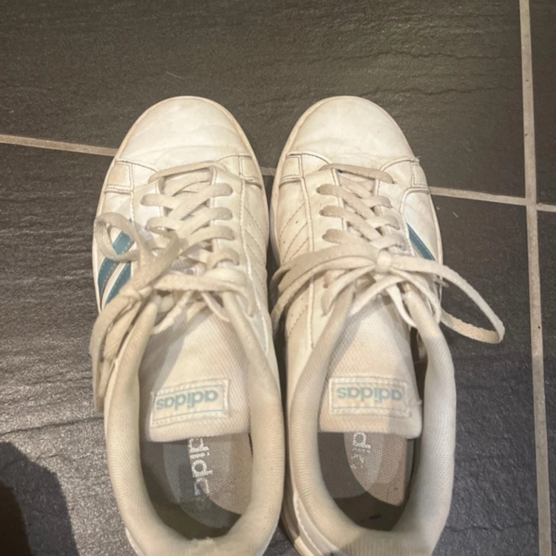 Säljer ett par klassiska vita Adidas sneakers i strl 38 med de ikoniska tre blå ränderna på sidan. Skorna har snörning och en bekväm passform. Kom privat för frågor🩷