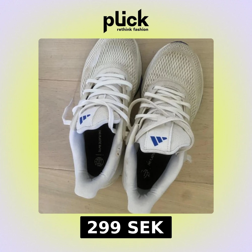 Fräscha vita Adidas sneakers med blå detaljer och sula. Ovandelen är i ventilerande mesh och har klassiska snörningar. Snyggt Adidas-märke på plösen och diskreta ränder på sidan. Perfekta för träning eller chill vardagsstil. Lite skitiga men går nog bort om man tvättar noggrant.