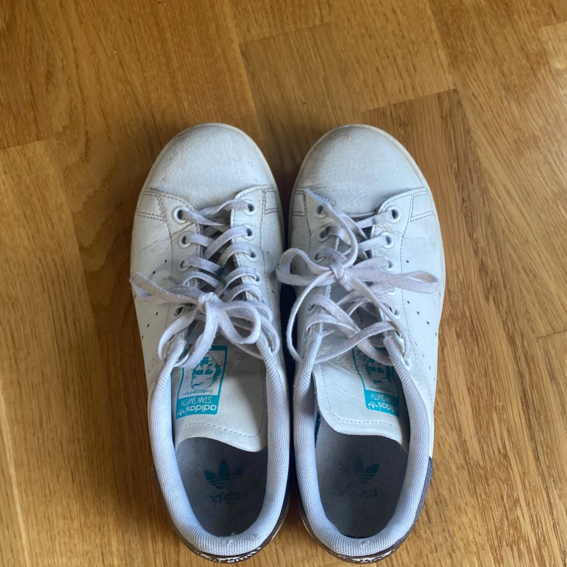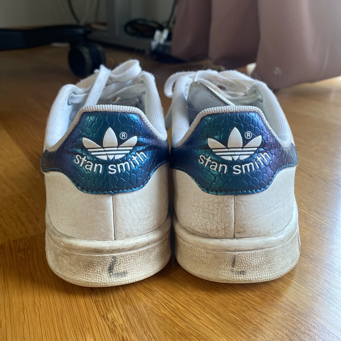 Klassiska Adidas Stan Smith sneakers i vitt skinn med snörning och rund tå. Hälpartiet har en blåskimrande detalj med Stan Smith-logga och ormskinnsmönster. Perfekta för en clean och sportig look. I använt skick därav priset. Kontakta gärna för mer bilder eller frågor!🥰