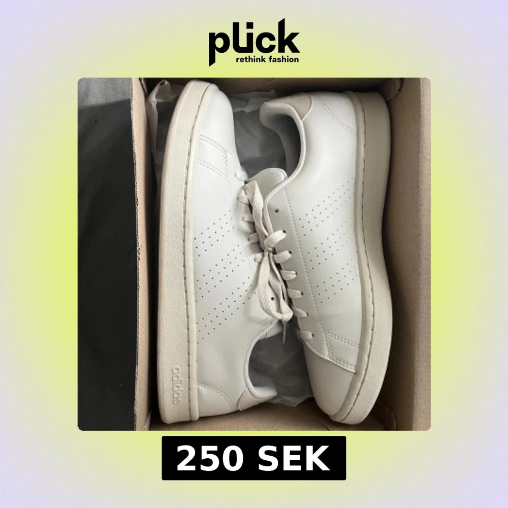 Säljer ett par klassiska vita Adidas Stan Smith sneakers i skinn med diskret perforerat mönster på sidorna och matchande vita snören. Perfekta för en clean och stilren look. Skorna kommer i originalkartong.