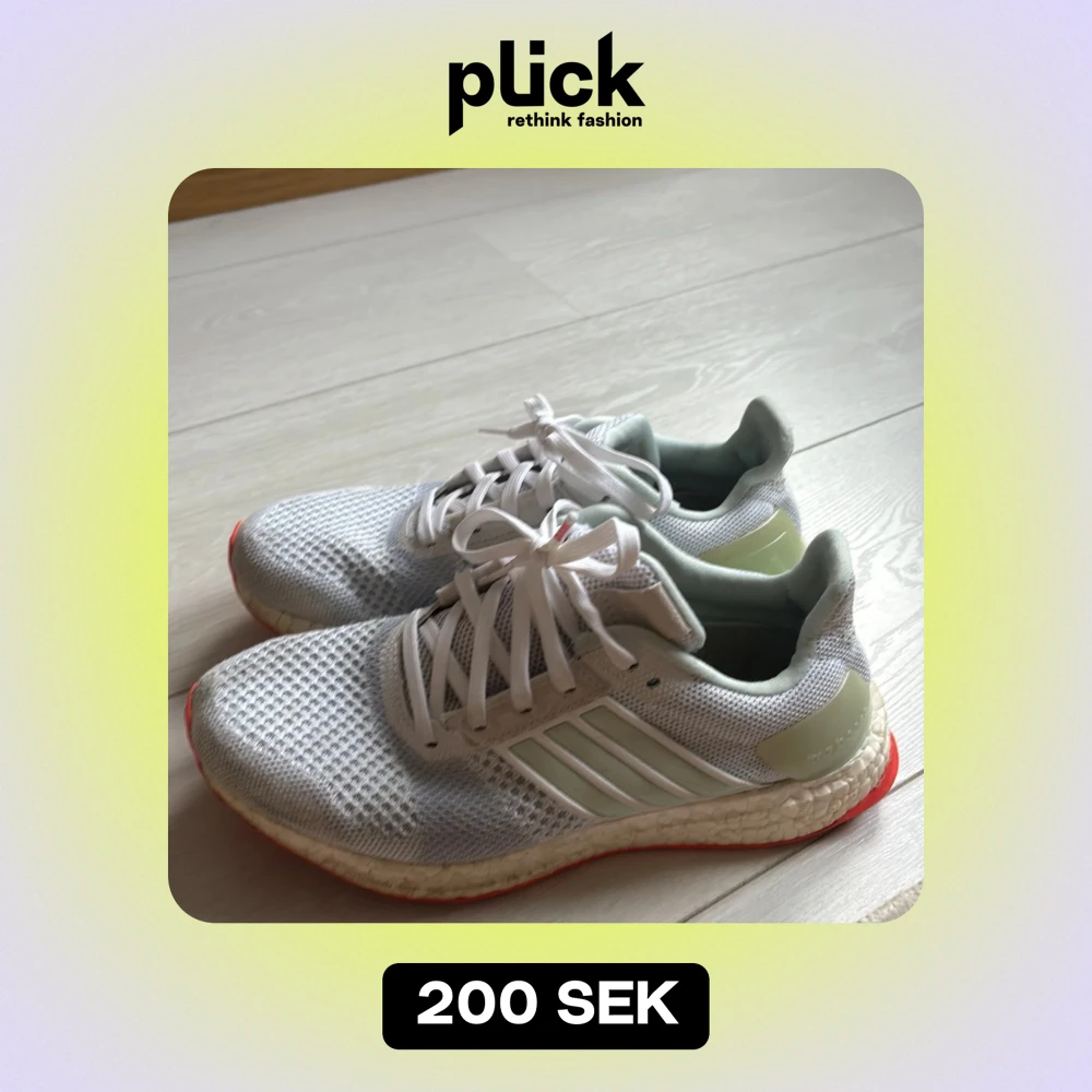 Säljer ett par vita Adidas Ultraboost sneakers i mycket bra skick. De har en snygg och stilren design med vit mesh och grå detaljer. Perfekta för både träning och vardag. Skorna har en bekväm passform och Boost-sula för extra komfort.