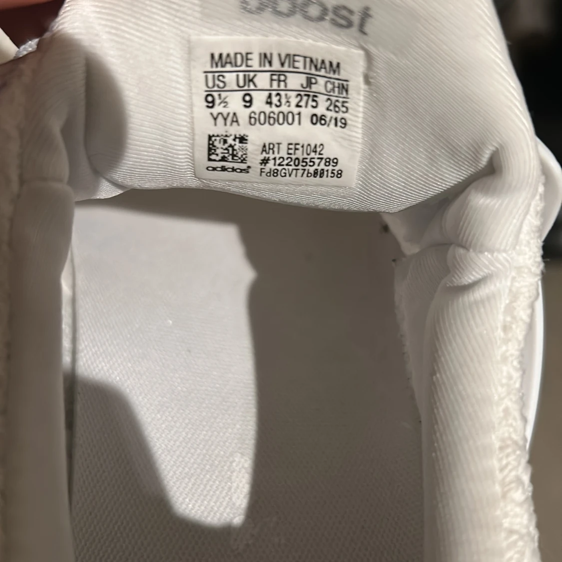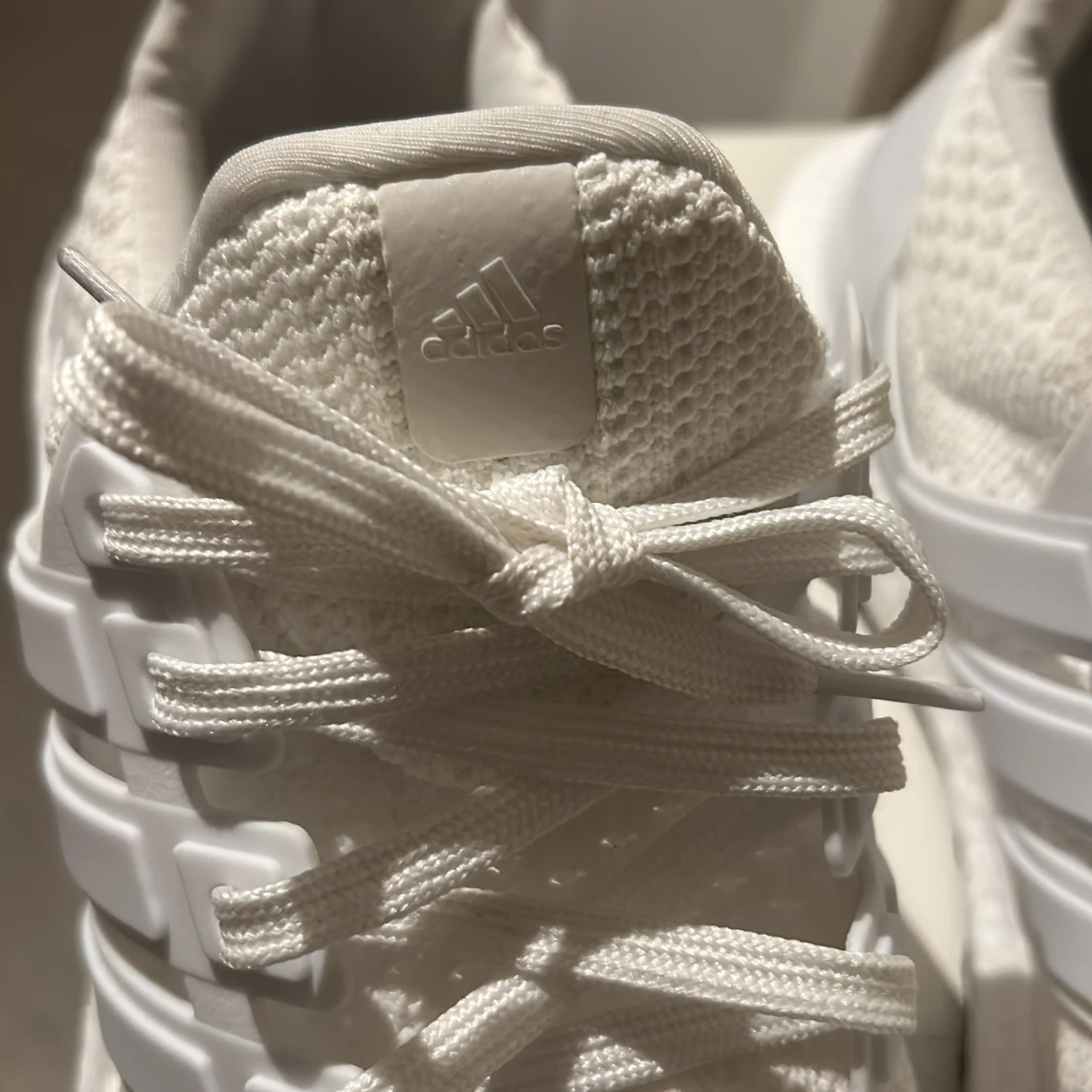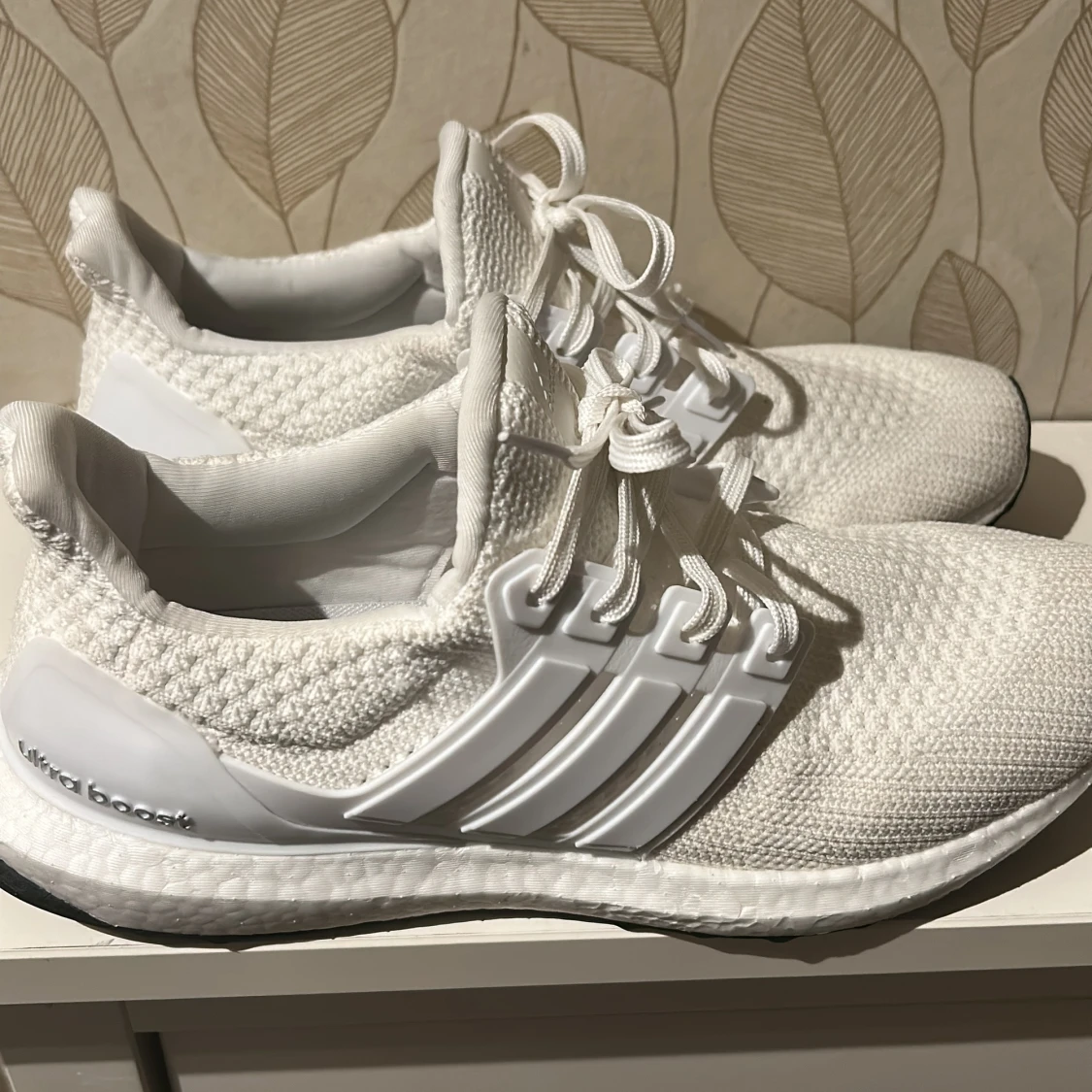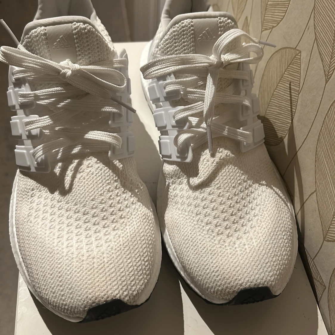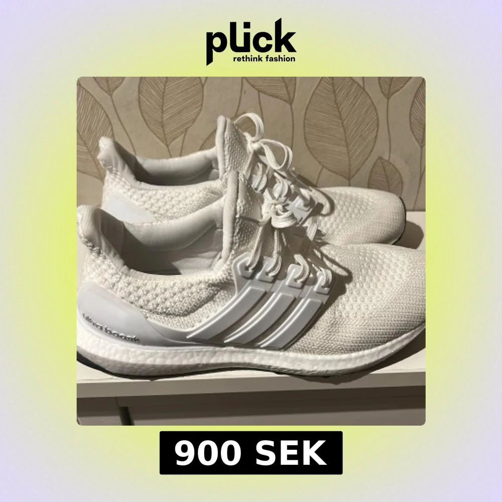 Säljer ett par fräscha Adidas Ultraboost sneakers i helvitt. Skorna har stickad ovandel, klassiska tre ränder på sidan och snörning. Boost-sulan ger grym komfort och respons. Perfekta för dig som gillar stilrena och sportiga sneakers.