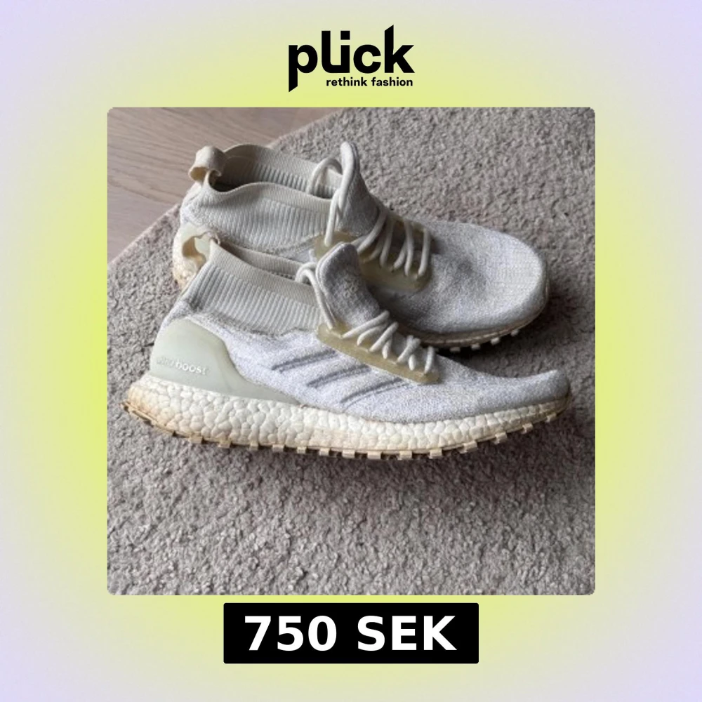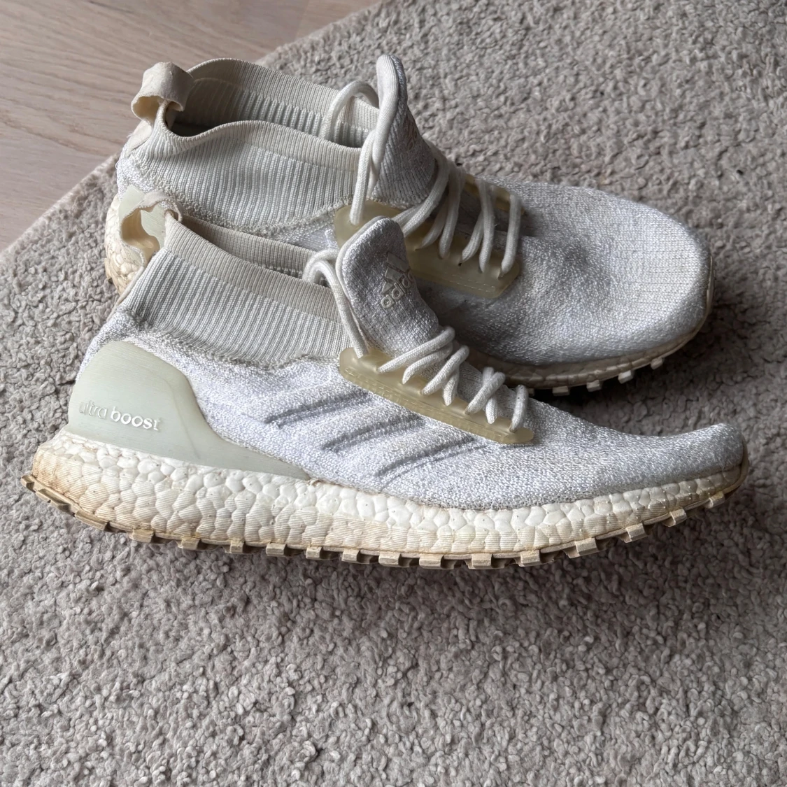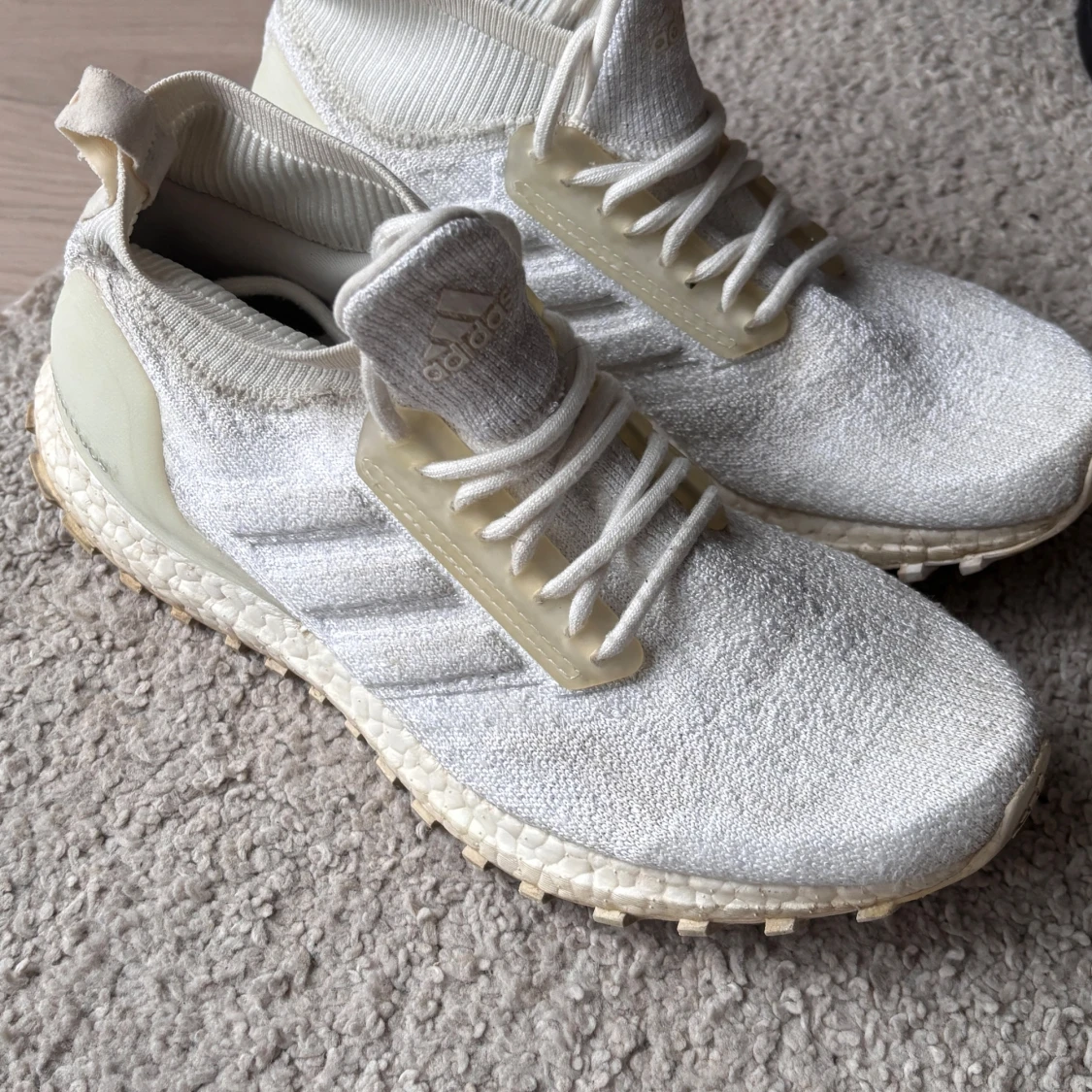 Säljer ett par vita Adidas Ultraboost sneakers med stickad ovandel och högt skaft. Skorna har snörning, platt sula och diskreta ränder på sidan. Perfekta för dig som gillar stilrena och bekväma skor.
