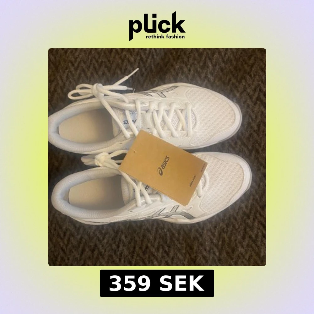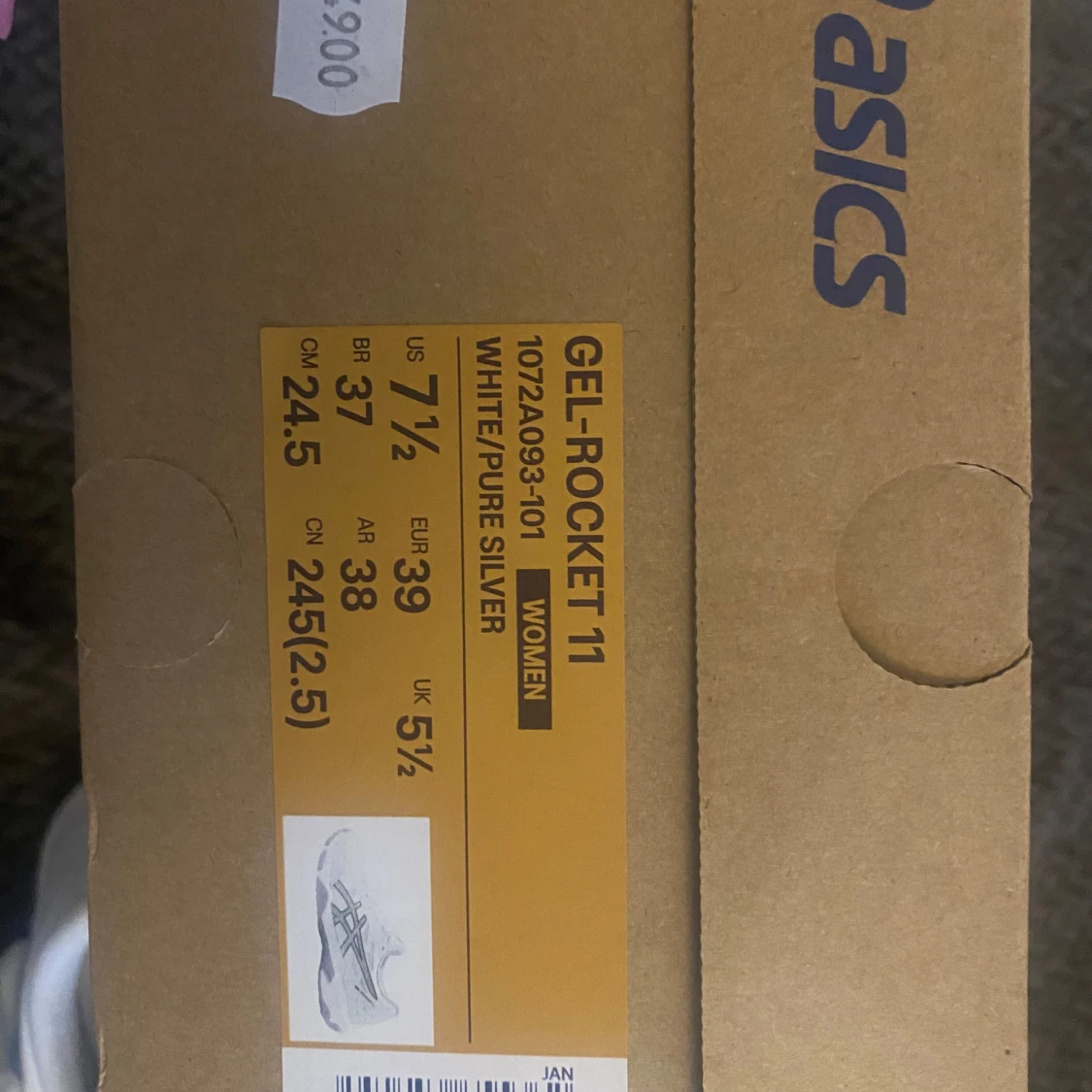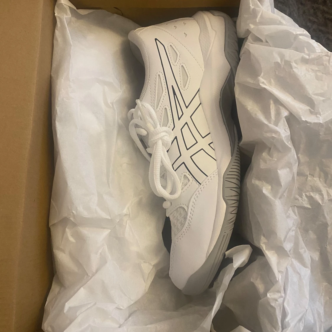 Säljer ett par vita Asics Gel-Rocket 11 med silverdetaljer. Perfekta för inomhussporter med bra grepp och komfort. Skorna har snörning och en stilren design. De är helt oanvända och lådan har endast öppnats.