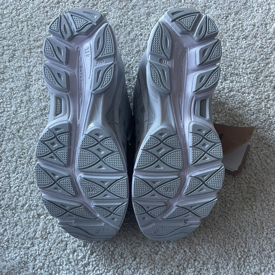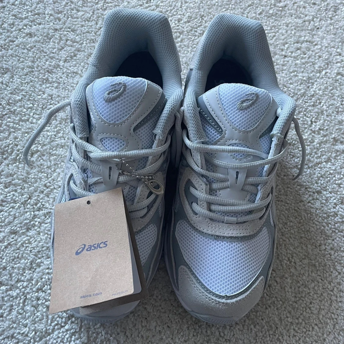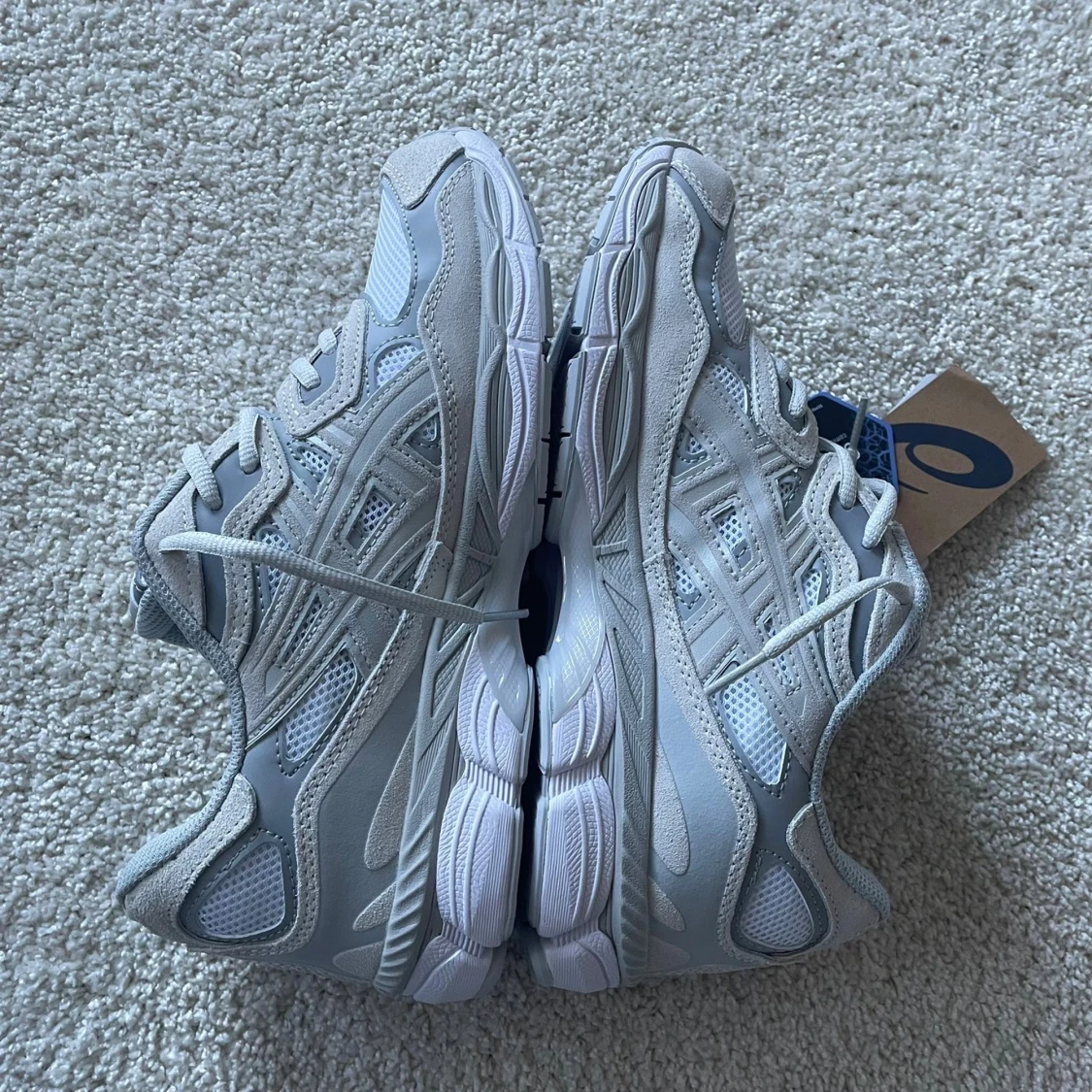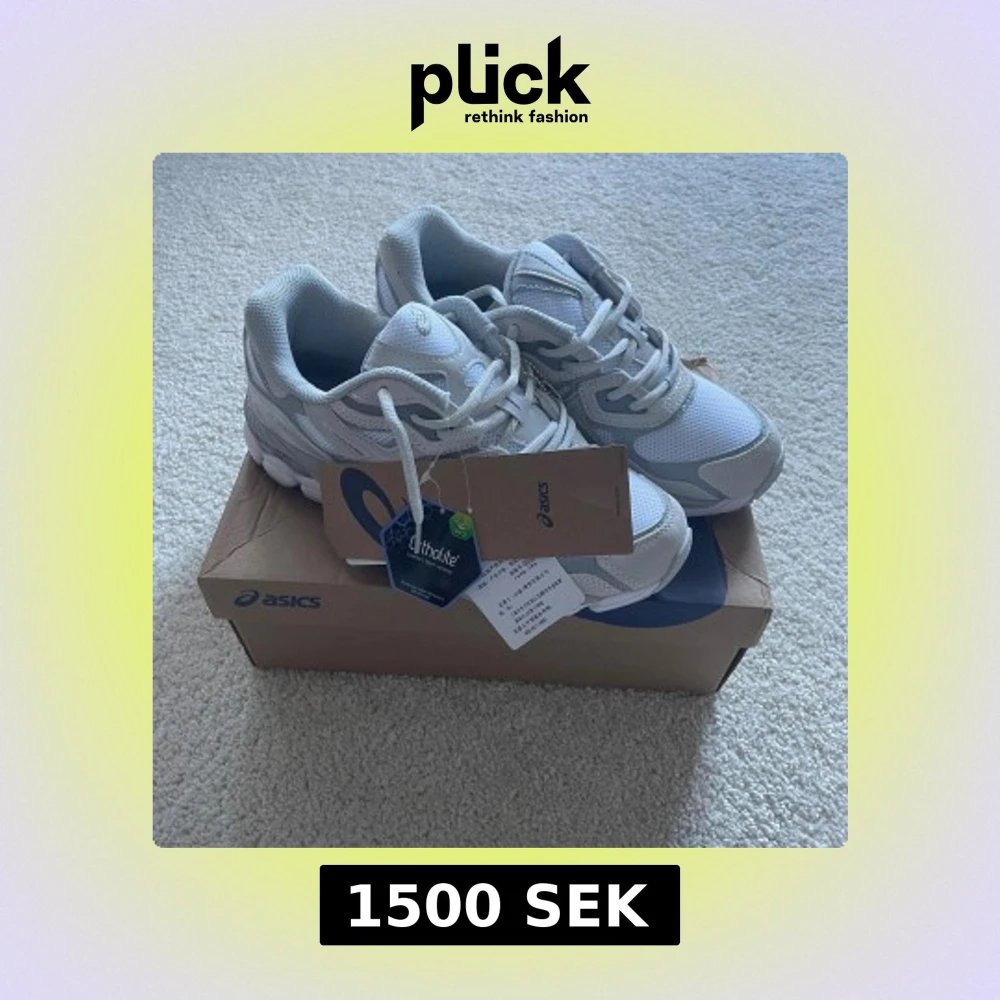 Snygga vita Asics sneakers med detaljer i ljusgrått. Skorna har en sportig siluett, snörning och ovandel i mesh och mocka för extra andningsförmåga. Perfekta för dig som gillar stilrena och bekväma skor med chunky sula och klassisk Asics-logga på sidan.