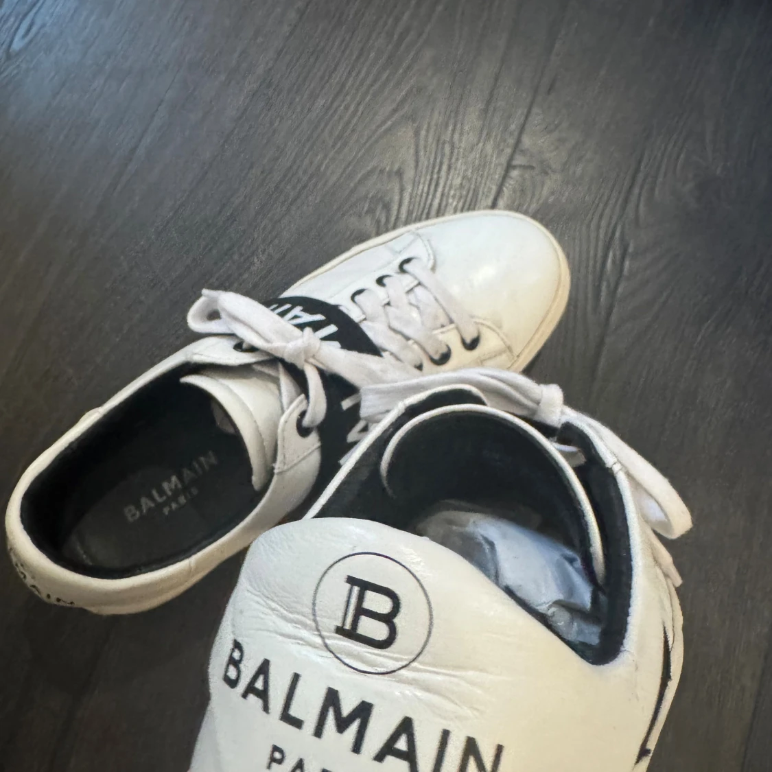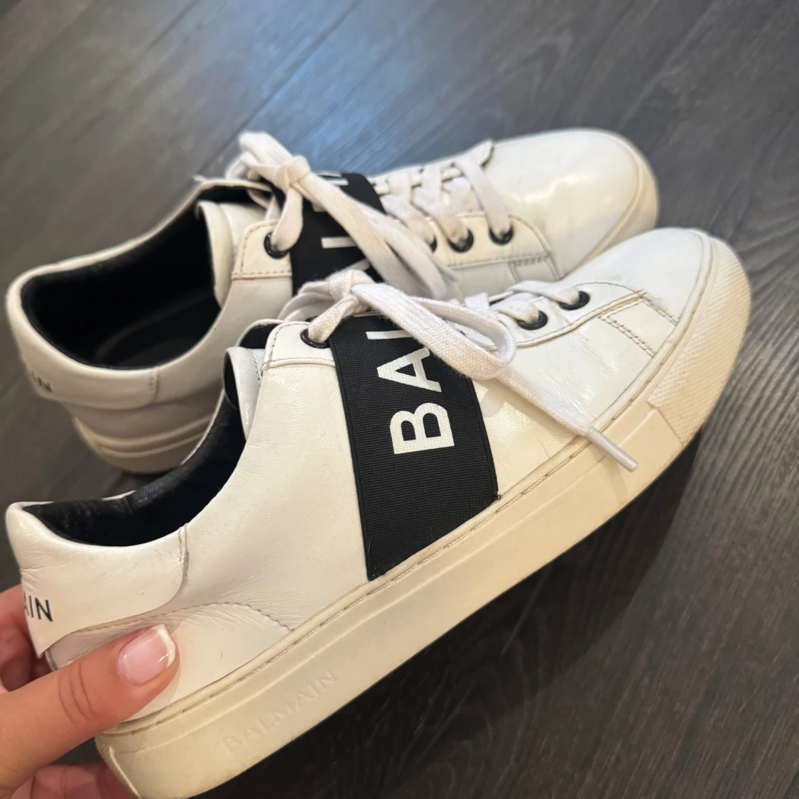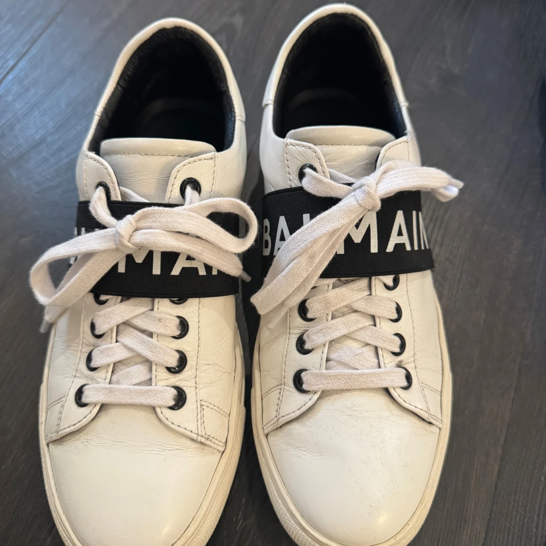 Snygga vita sneakers från Balmain med svart band över vristen där det står BALMAIN i vitt. Skorna har rund tå, vita snören och är gjorda i skinn. Insidan är svart och sulan är platt. Perfekta för dig som gillar stilrena och trendiga detaljer.