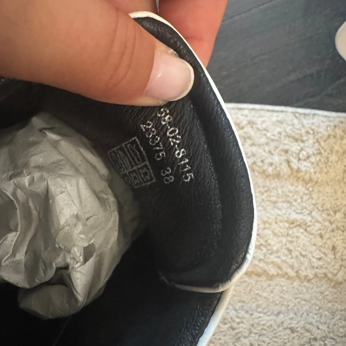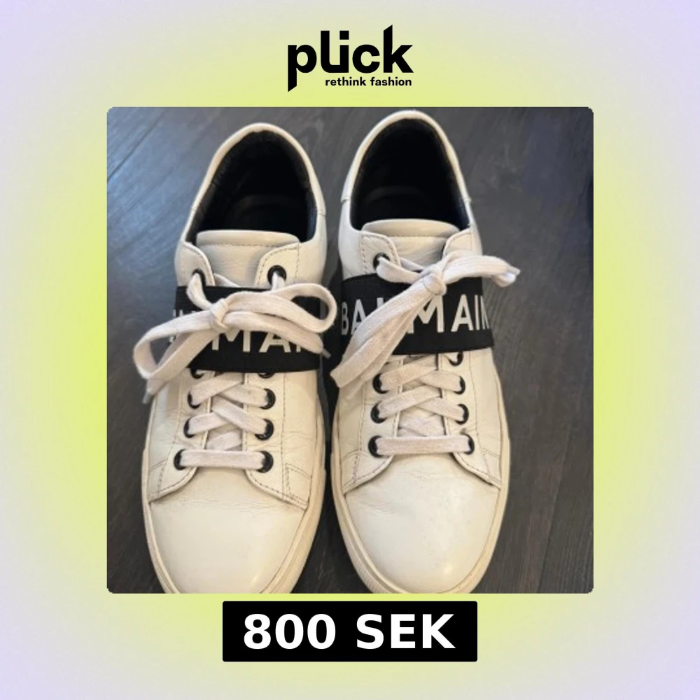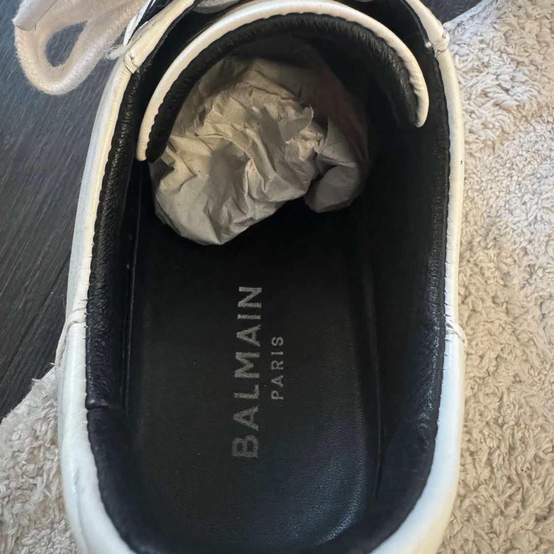 Snygga vita sneakers från Balmain med svart band över vristen där det står BALMAIN i vitt. Skorna har rund tå, vita snören och är gjorda i skinn. Insidan är svart och sulan är platt. Perfekta för dig som gillar stilrena och trendiga detaljer.