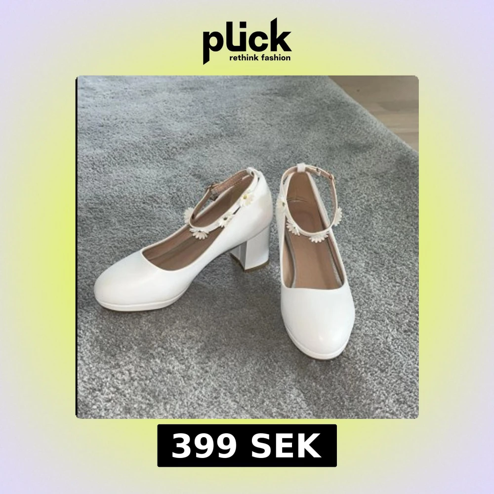 Söta vita klackskor med rund tå och blockklack. Skorna har en rem runt ankeln dekorerad med små vita blommor och gulddetaljer. Perfekta för dig som vill ha en gullig och stilren look. Tillverkade i syntetmaterial med mjuk innersula. Aldrig använda.