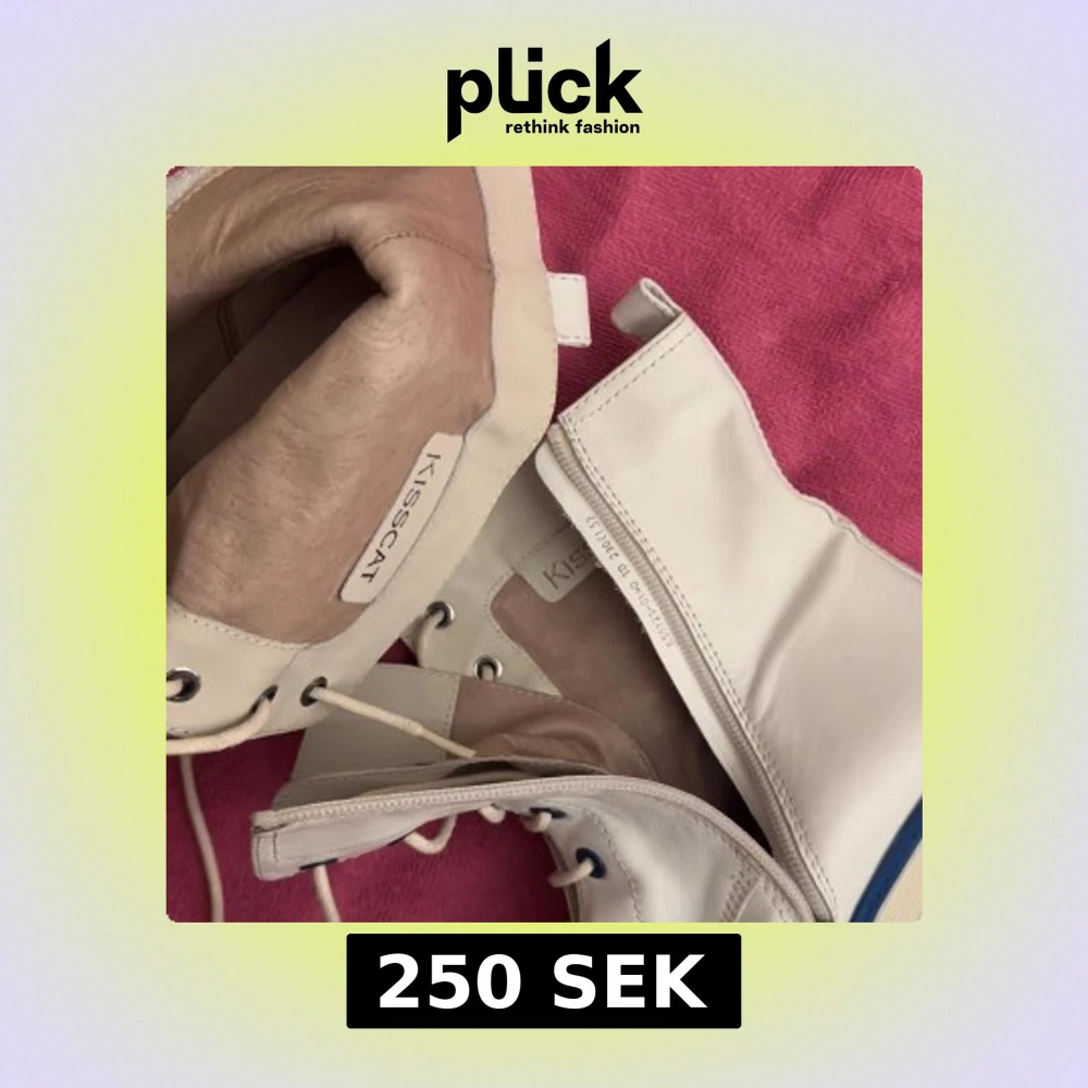 Säljer ett par vita boots från KISSCAT med kraftig klack och blå detaljer. Skorna har snörning, dragkedja på sidan och dekorativa fyrkantiga nitar. Tillverkade i skinn och har rund tå.