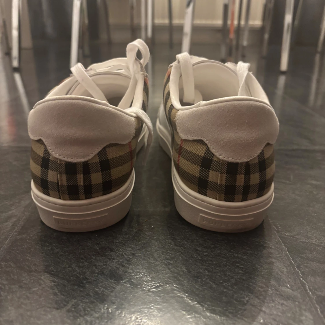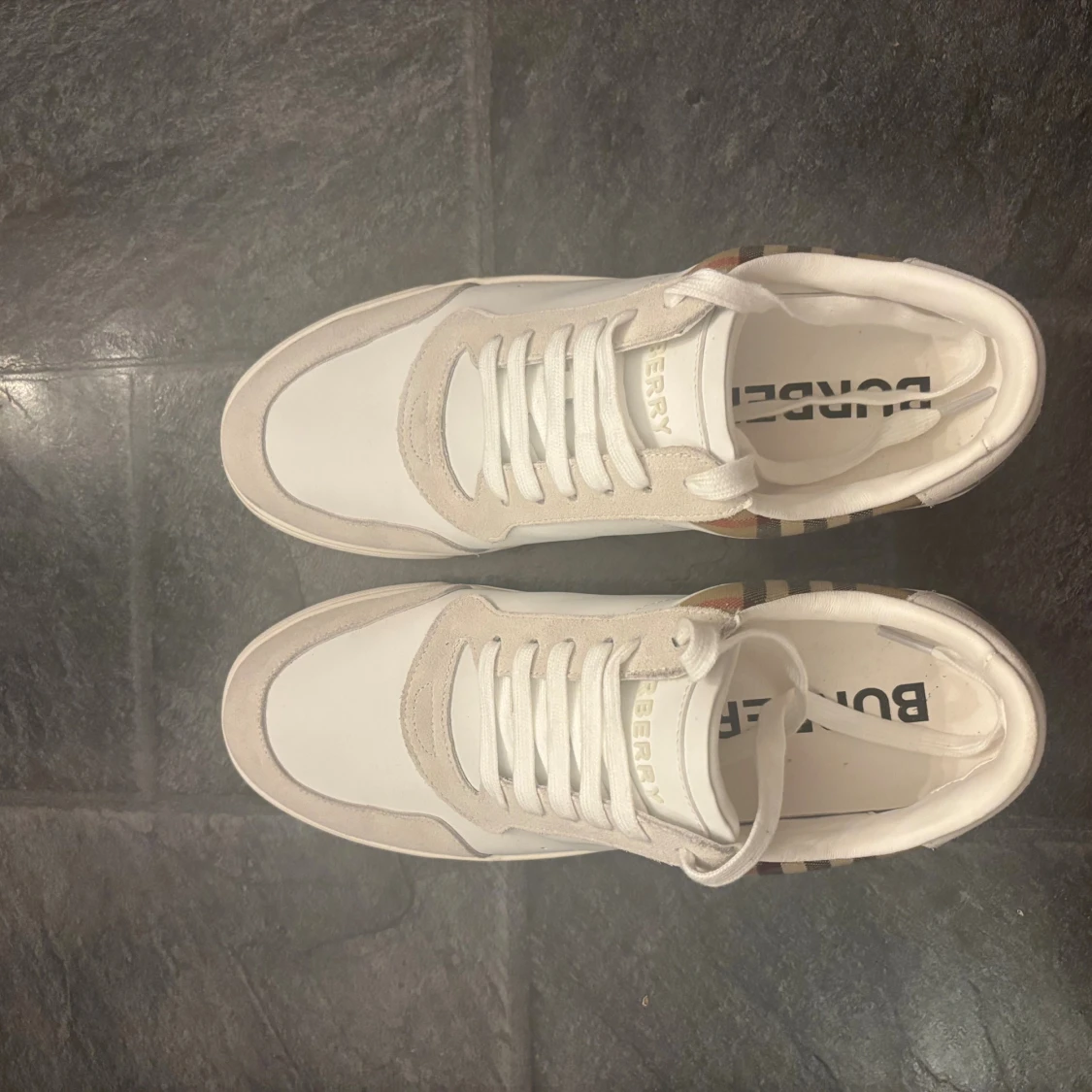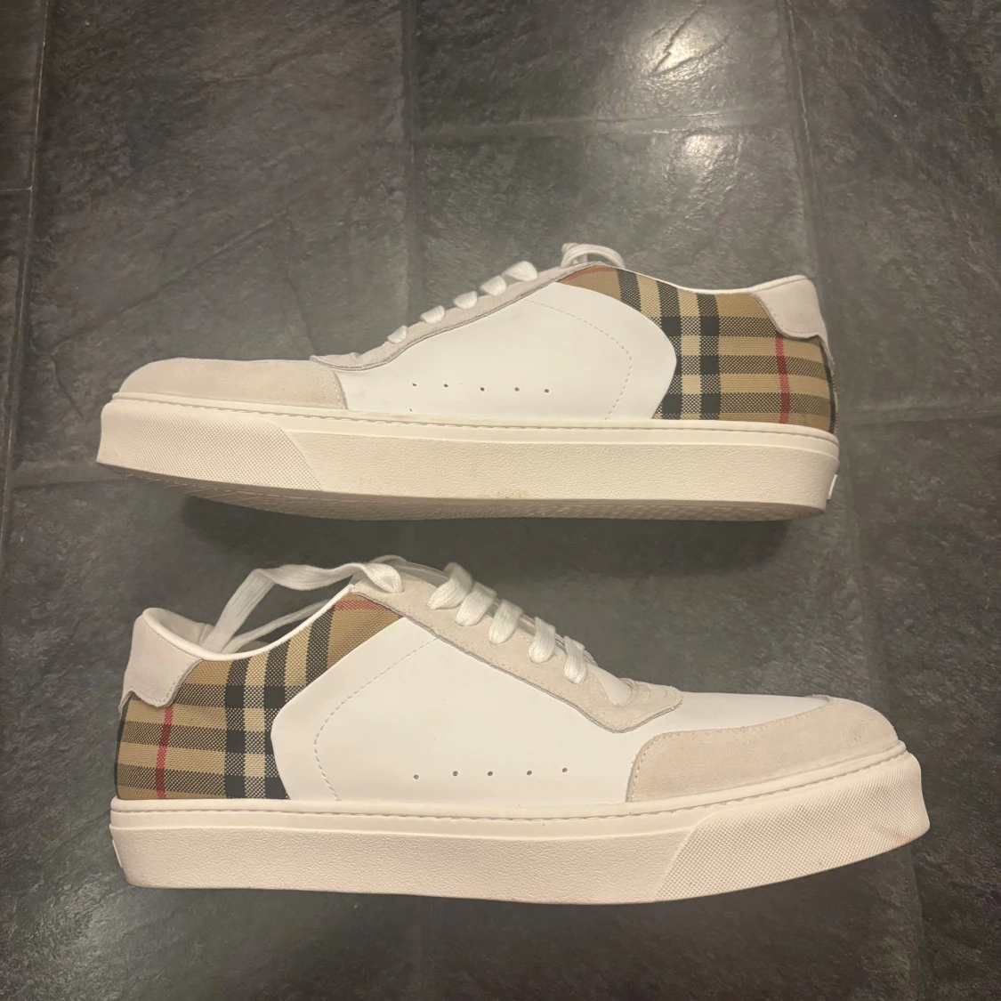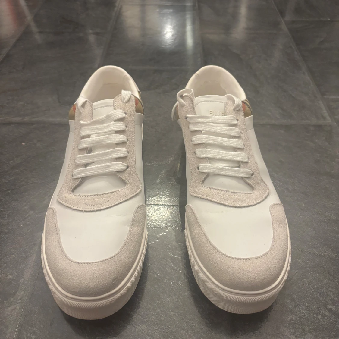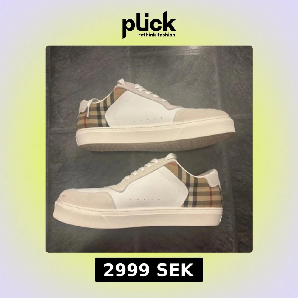 Snygga vita sneakers från Burberry. Det är en materialmix av skinn och mocka ger en lyxig känsla och den rutiga designen gör dem riktigt unika. De är i storlek 46 och är knappt använda 🙌