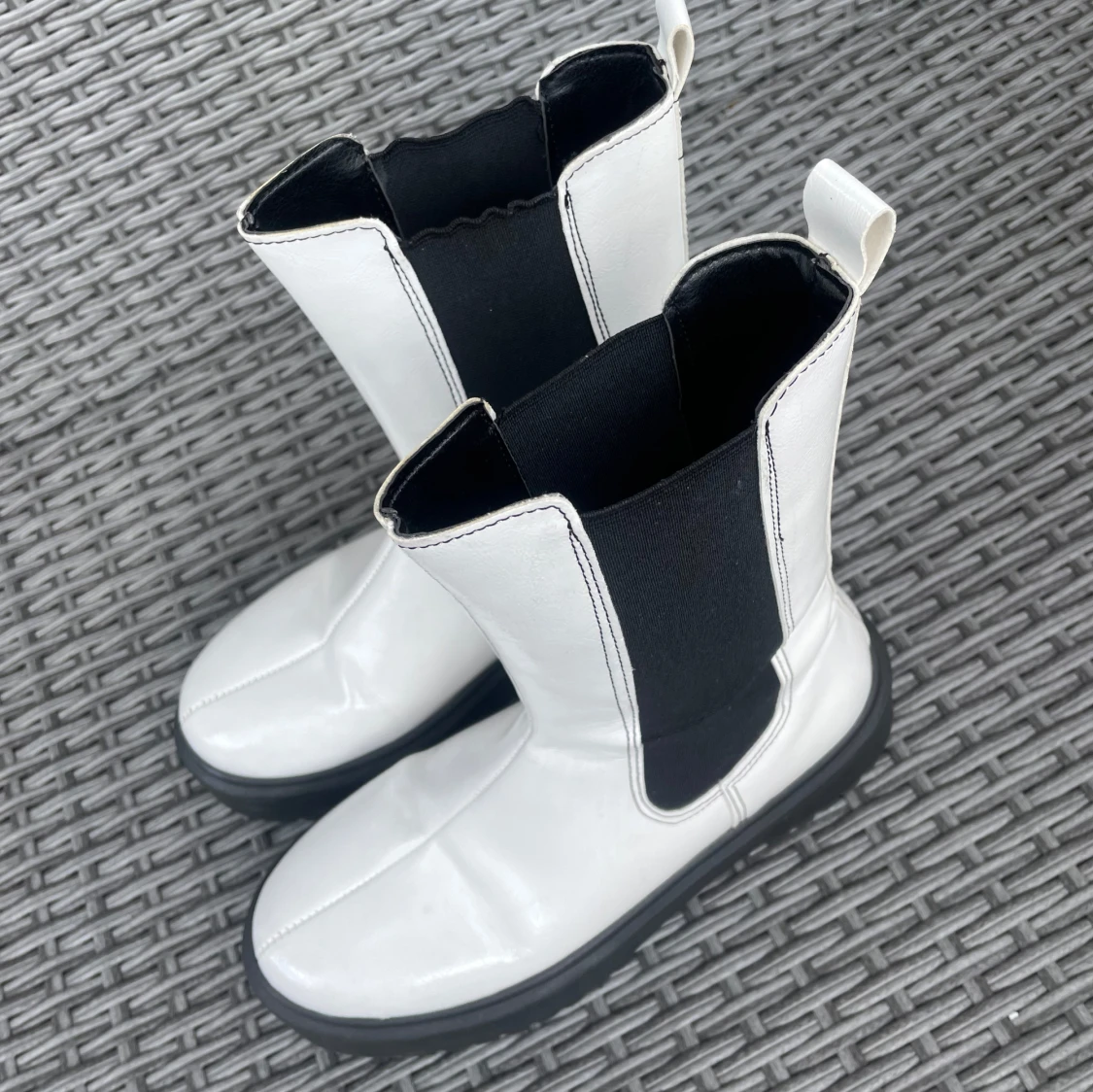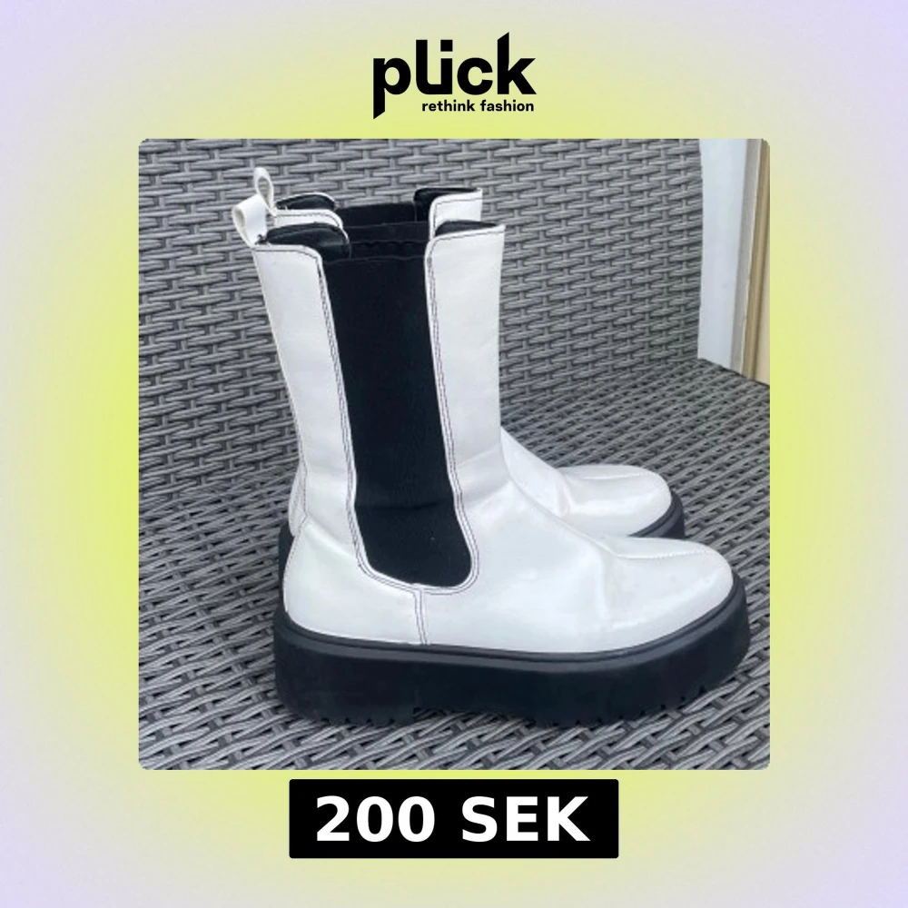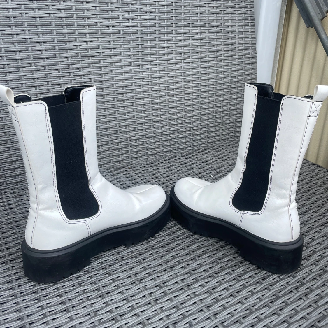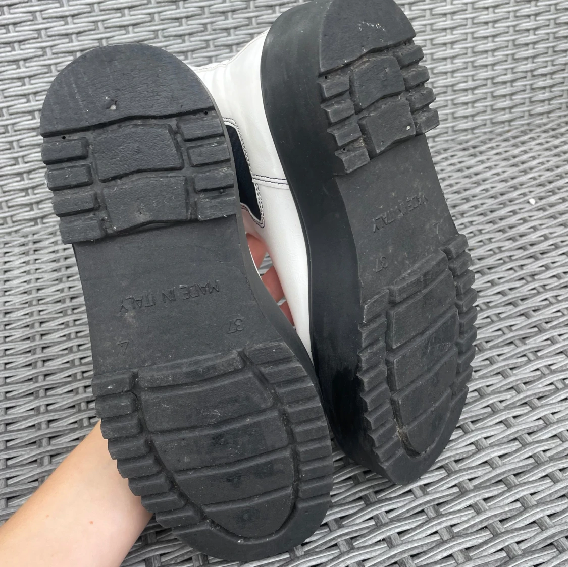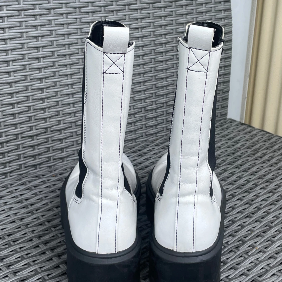 Snygga vita chelsea boots med svart resår på sidorna och kraftig svart platåsula. Boots med rund tå och dragflik bak. Perfekta för dig som vill sticka ut med en modern och edgy look.Använda 1-2ggr, mkt bra skick. Grova boots i vitt lack på ovansidan och svart sula. Storlek 37, normal i storlek.