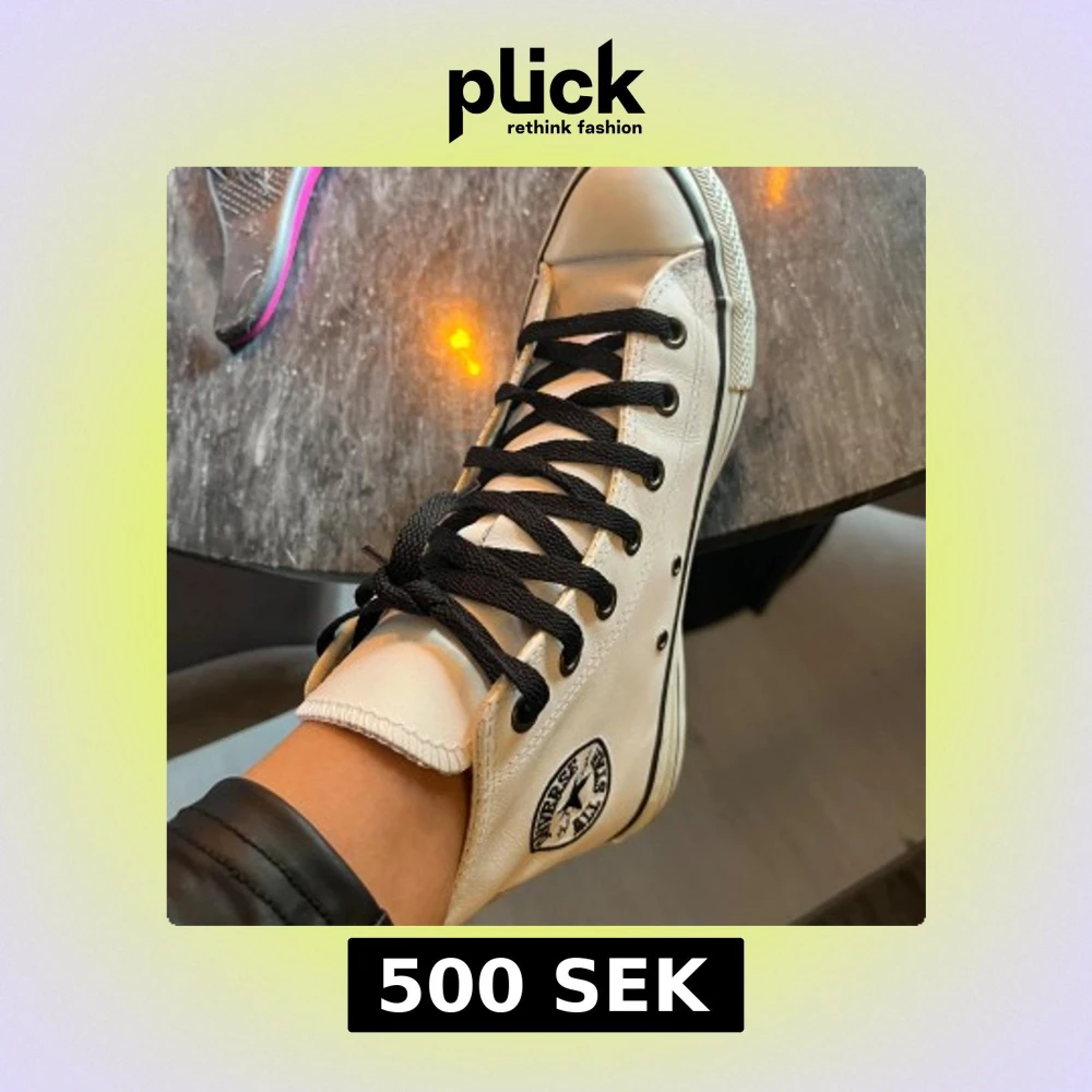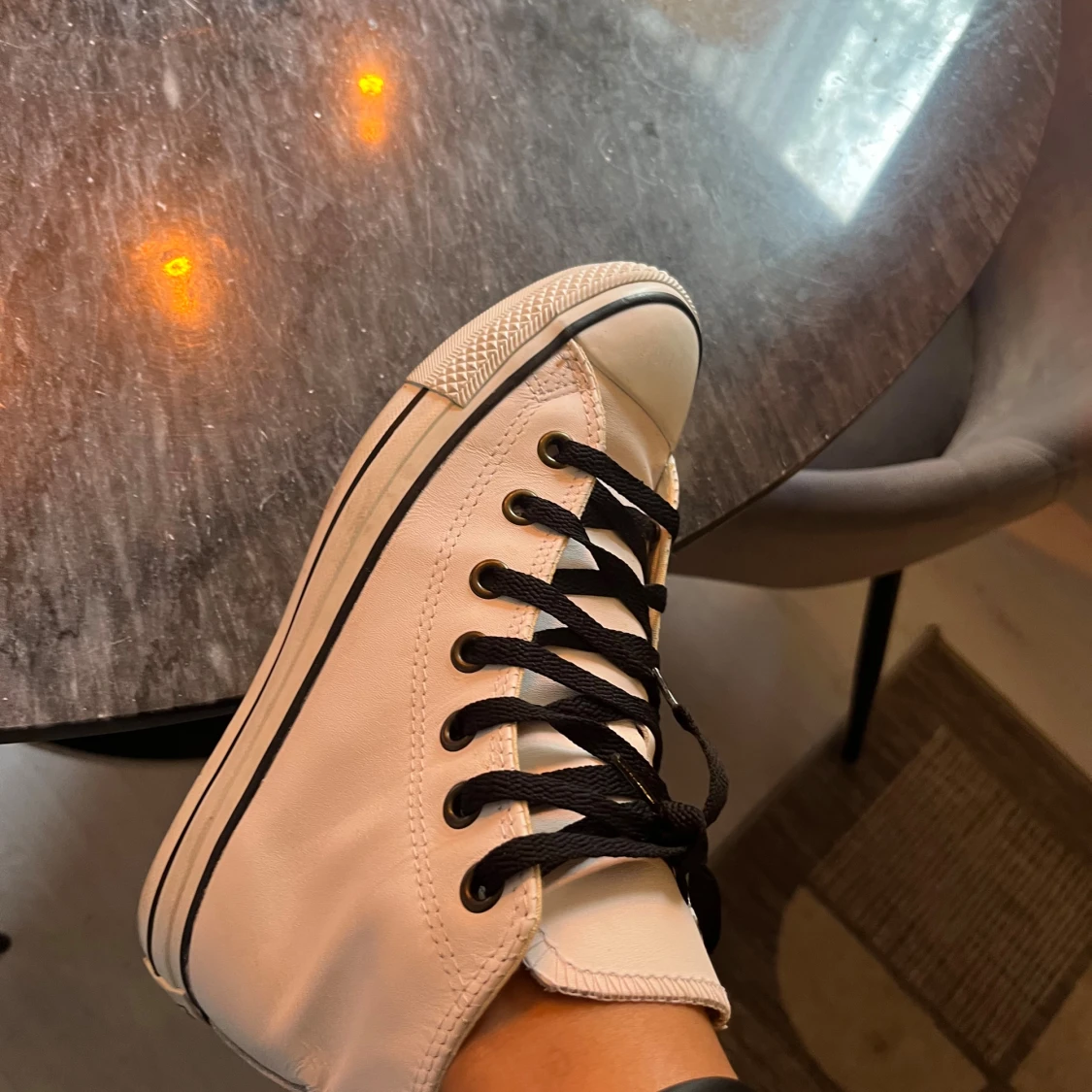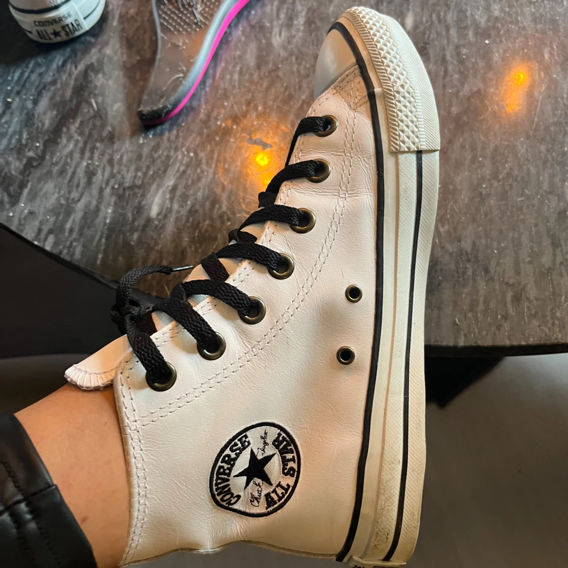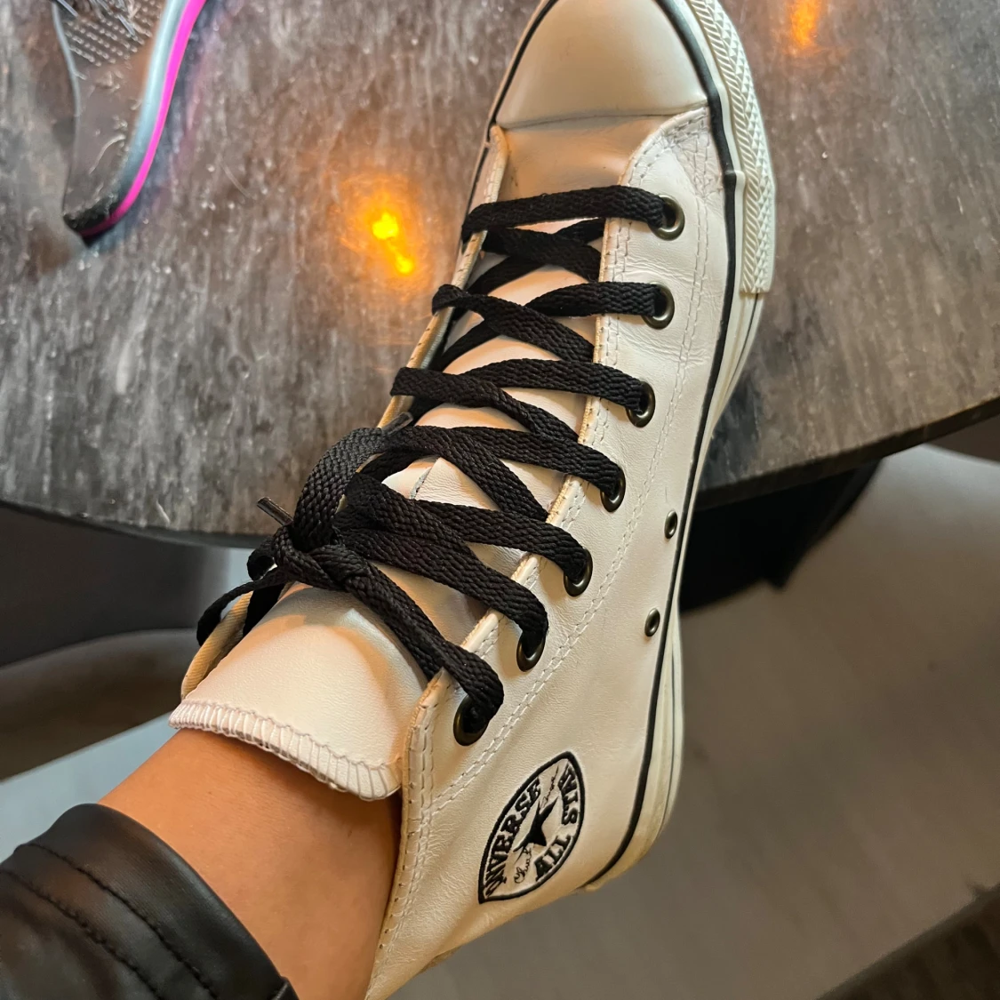 Säljer ett par klassiska vita Converse All Star high-top sneakers i skinn med svarta snören och svarta detaljer. Skorna har rund tå, platt sula och den ikoniska Converse-loggan på sidan. Perfekta för dig som vill ha en tidlös och clean look. Använda 2 gånger