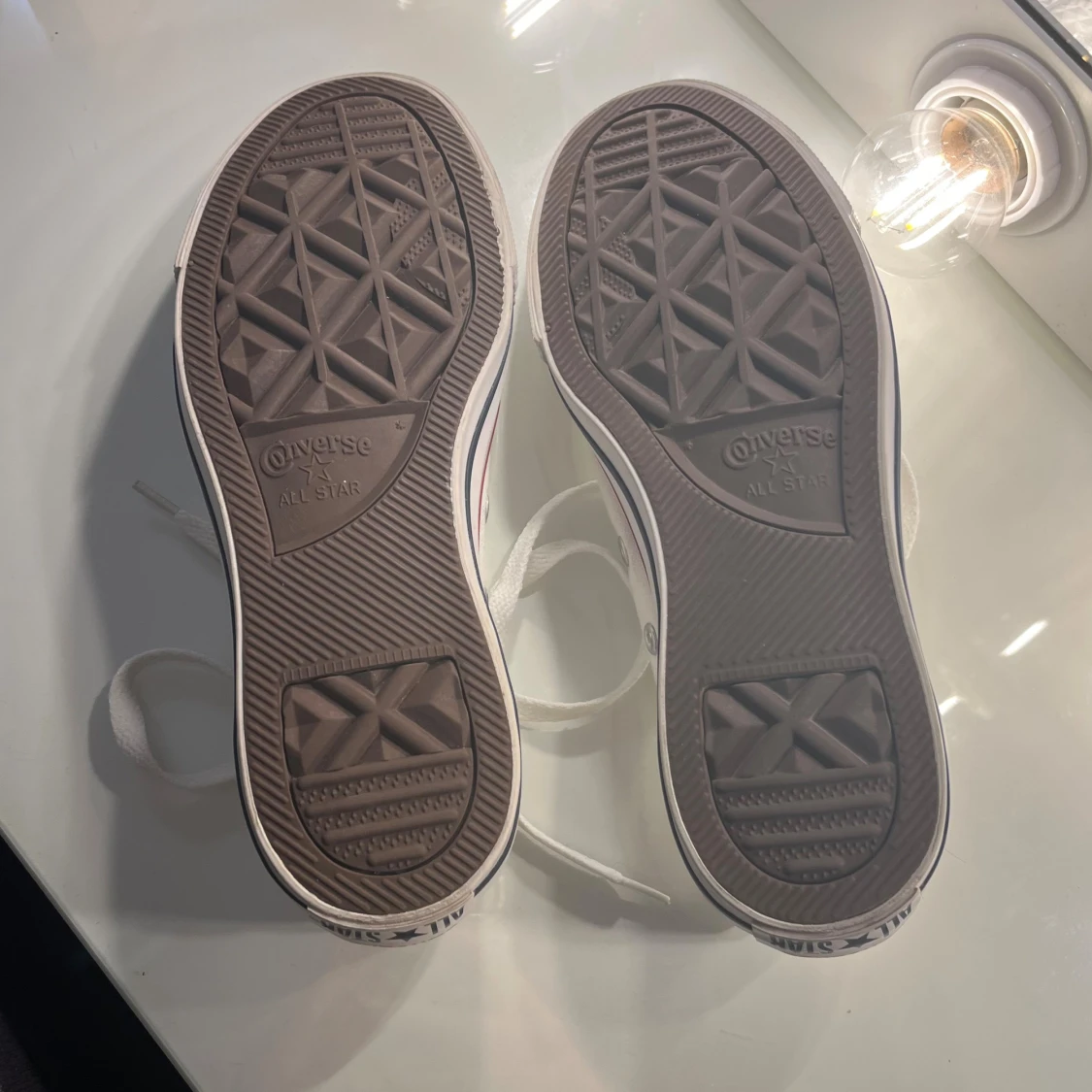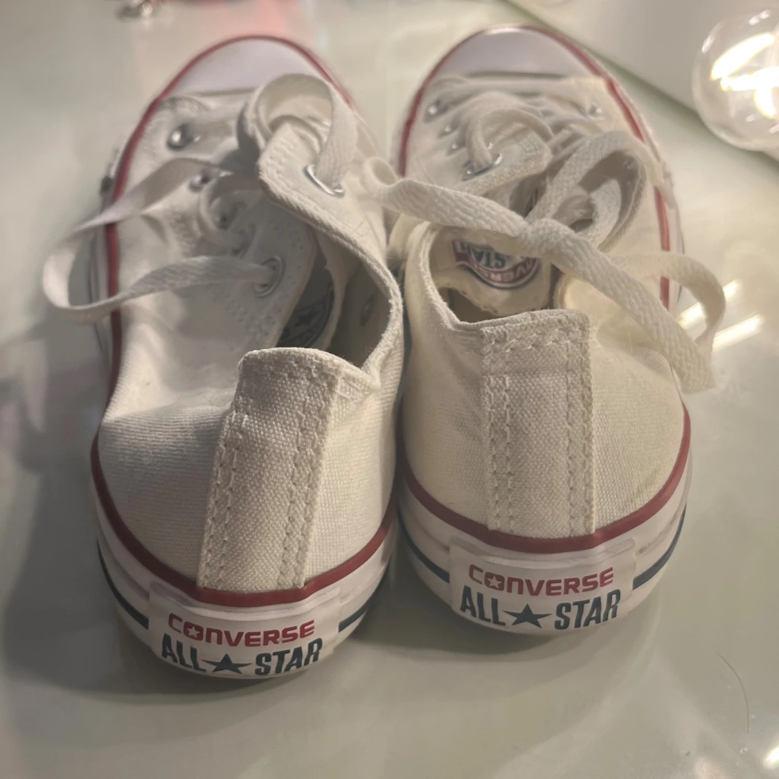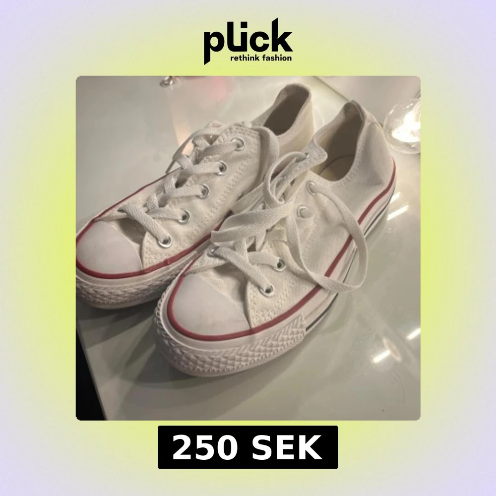 Klassiska vita Converse All Star sneakers i canvas med röda och blå detaljer runt sulan. Lågt skaft, snörning framtill och rund tå. Perfekta för en clean och tidlös stil. Sula i gummi och ovandel i textil. Unisexmodell i storlek 36.