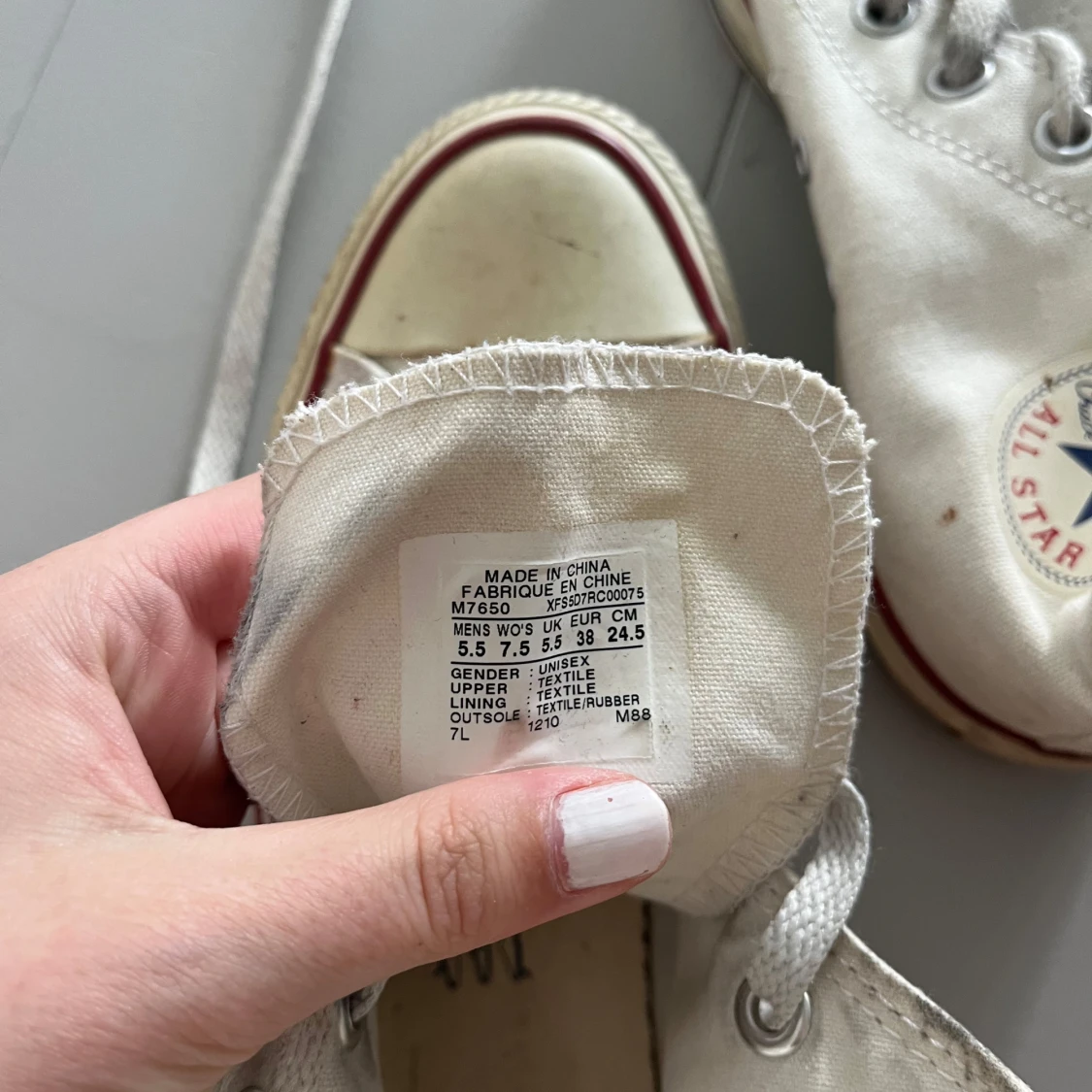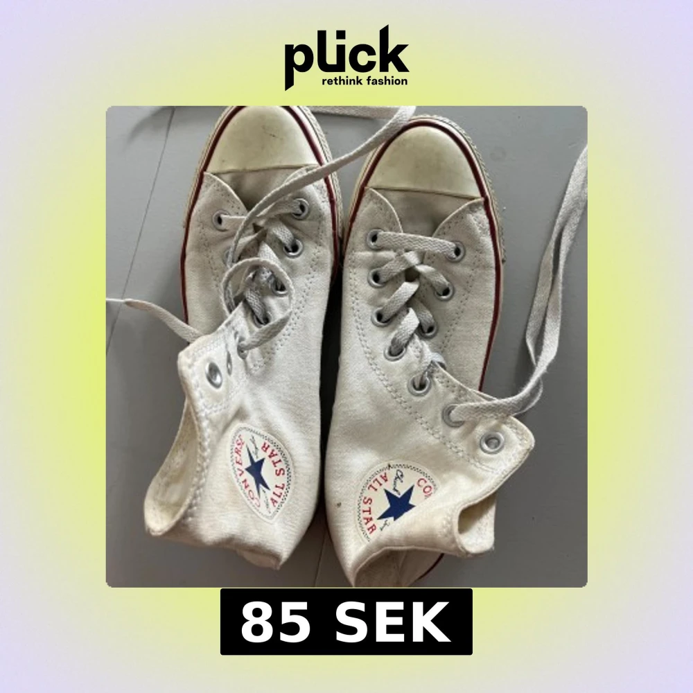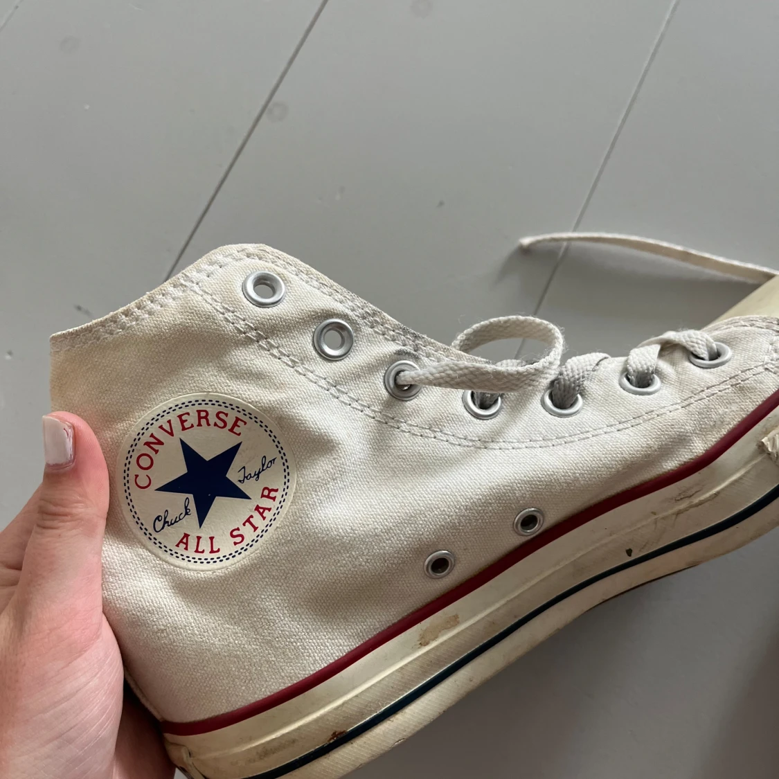 Klassiska vita Converse Chuck Taylor All Star high-tops med röd och blå rand längs sulan. Skorna har snörning, rund tå och är tillverkade i textil med gummisula. Perfekta för en avslappnad och cool streetstil. Storlek 38.