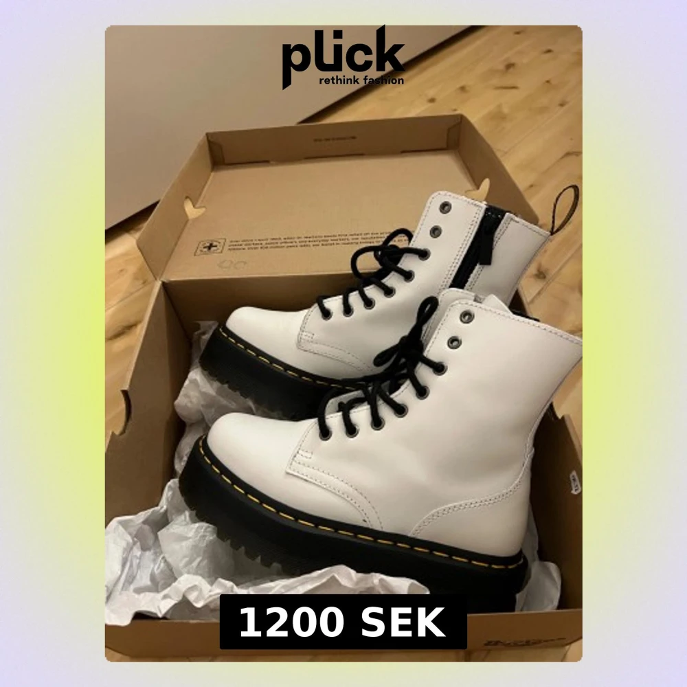 Säljer ett par vita Dr. Martens boots i skinn med kraftig platåsula och klassisk gul söm. Skorna har svarta snören, dragkedja på sidan och grovt mönstrad sula för extra grepp. Perfekt för dig som vill sticka ut med en edgy stil. De är nästan helt nya med boxen kvar, ändast använd en gång innan.