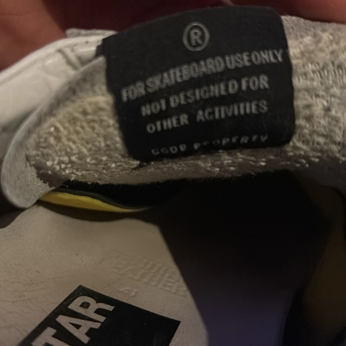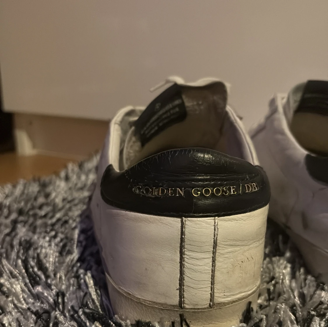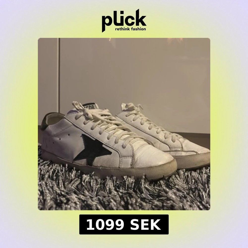 Snygga vita sneakers från Golden Goose med en svart stjärndetalj på sidan. Skorna har snörning och en svart häl med märkeslogga. Perfekta för en avslappnad stil. St:42 passar 43. Cond: 6/10 har kvar att ge har heeldrag på båda skorna! Skriv om du vill ha fler bilder på sula etc