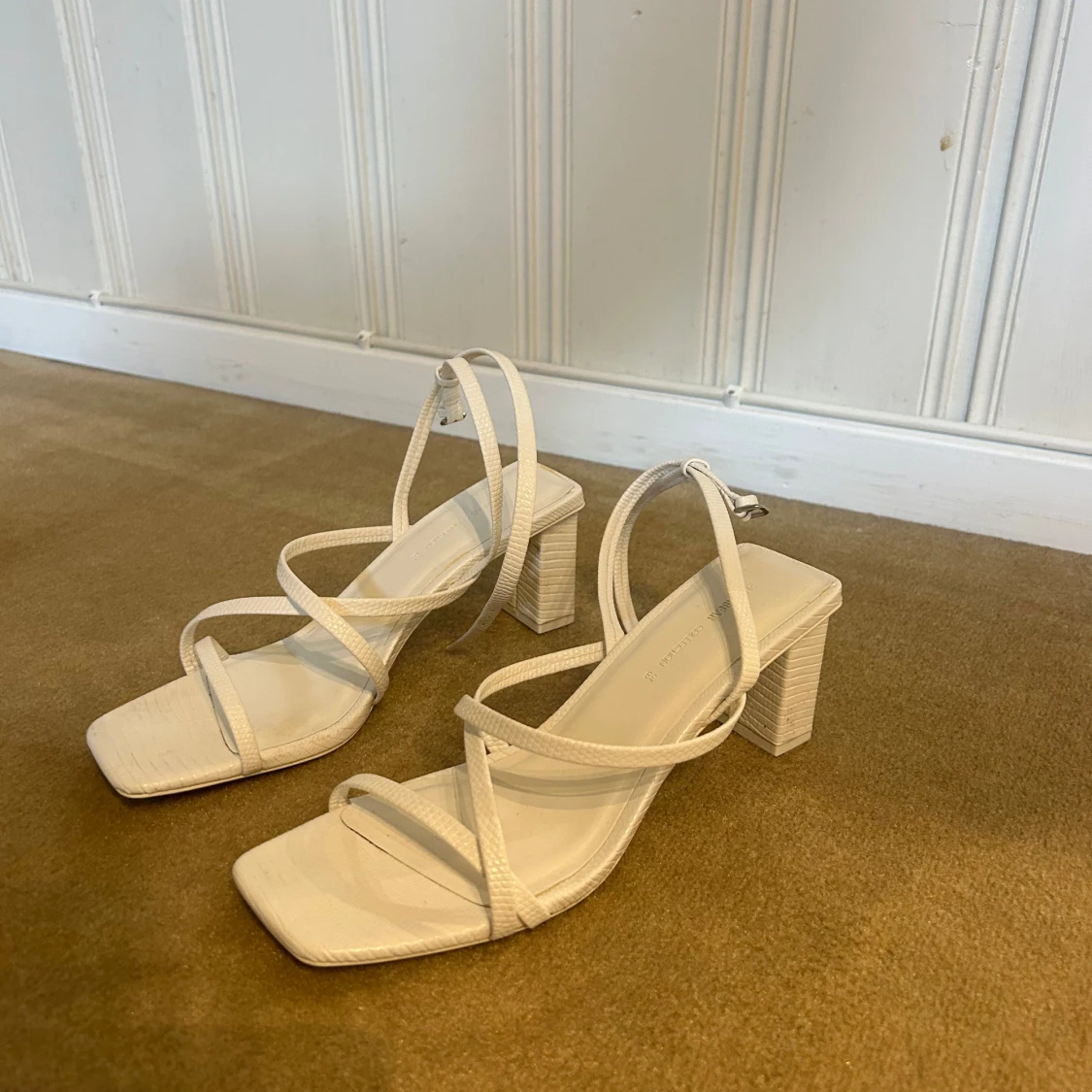 Snygga vita sandaler med fyrkantig tå, tunna remmar och blockklack. Skorna har en stilren design med struktur i materialet och justerbar rem runt vristen. Perfekta för att lyfta din sommarlook.