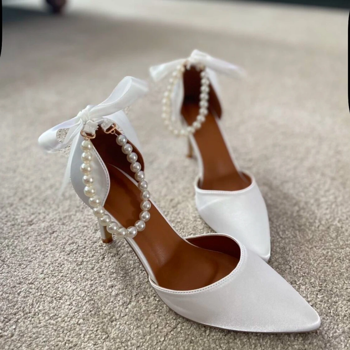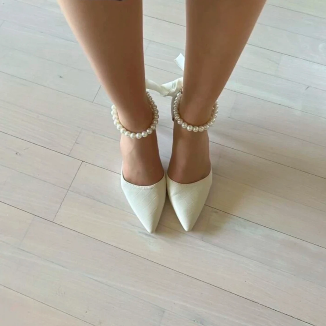 Eleganta vita klackar med pärlband runt ankeln. Passar perfekt till tex bröllop eller andra tillställningar. 8 cm hög klack och lätta att gå i.