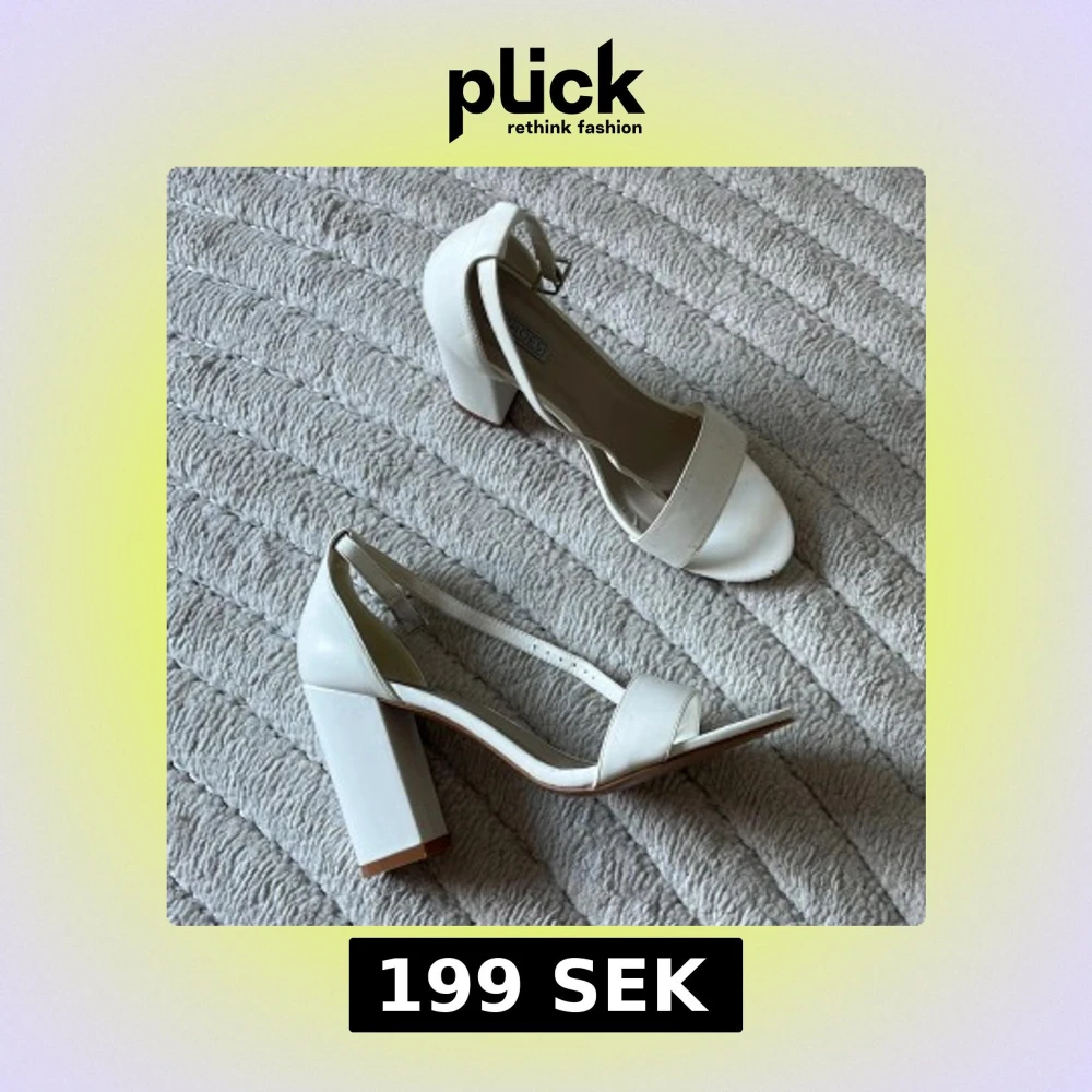 Säljer ett par stilrena vita klackskor från NLY Shoes. Skorna har öppen tå, bred klack och en enkel rem över foten samt runt vristen. Perfekta för dig som vill ha en klassisk och elegant look. 10cm klack. Använda men bra skick!