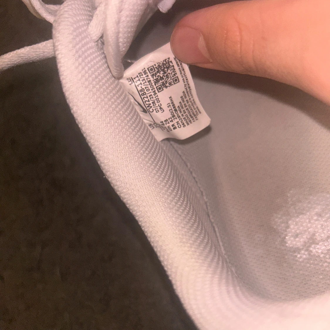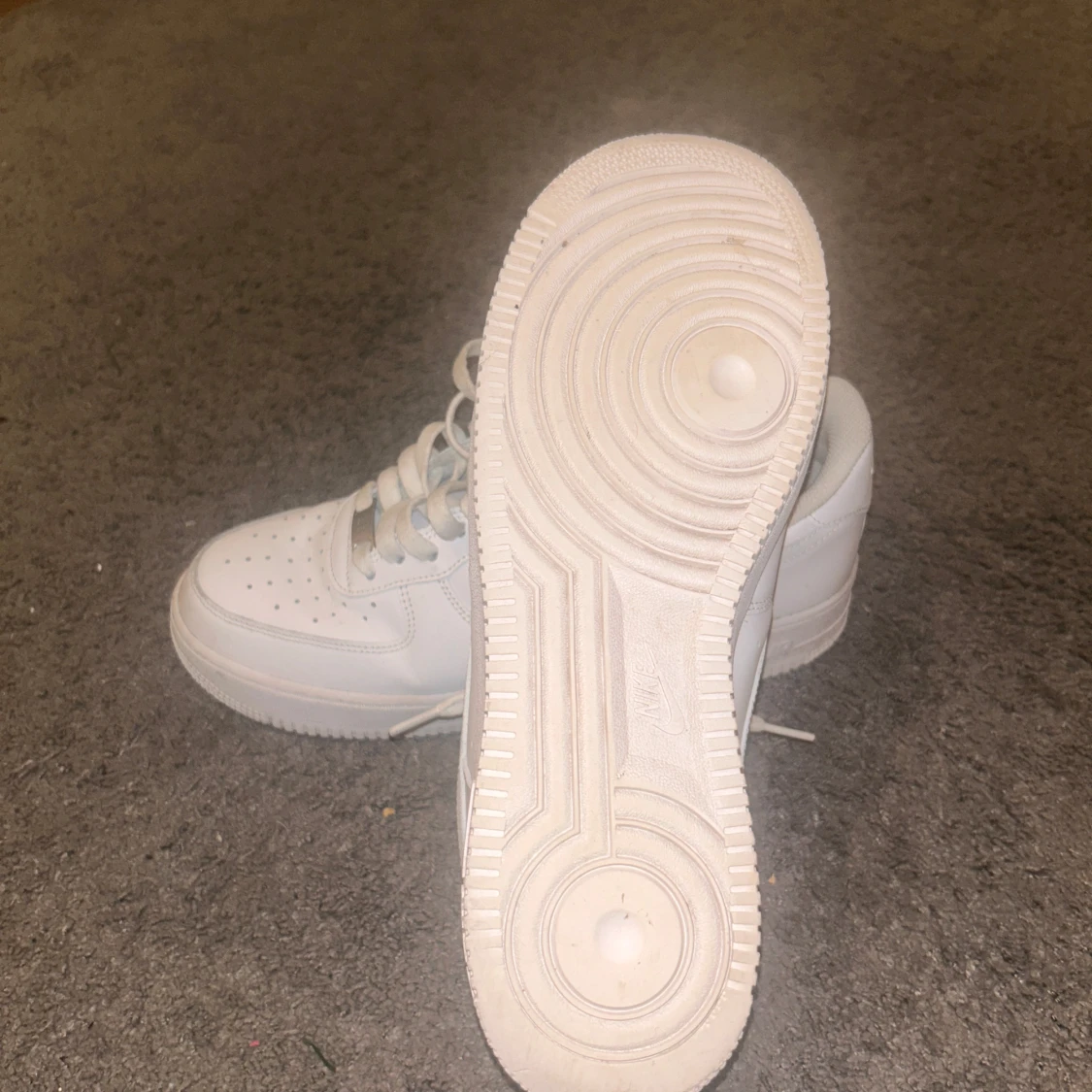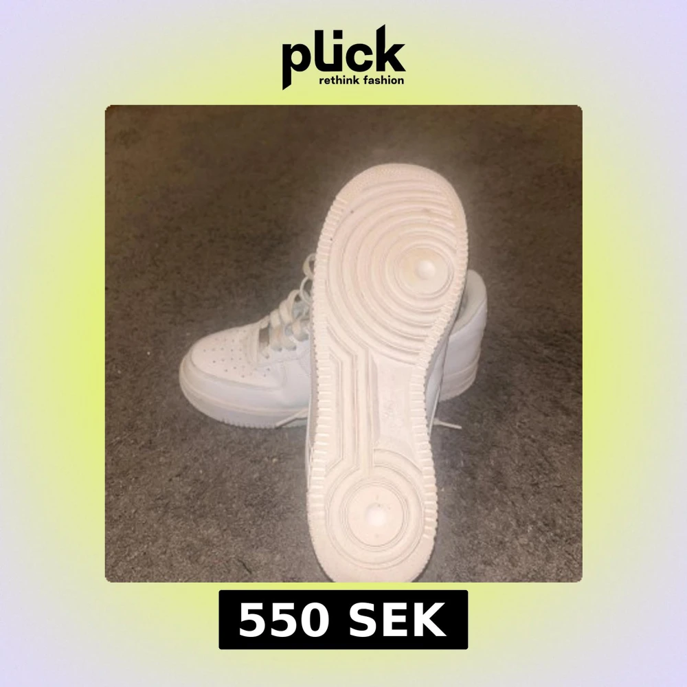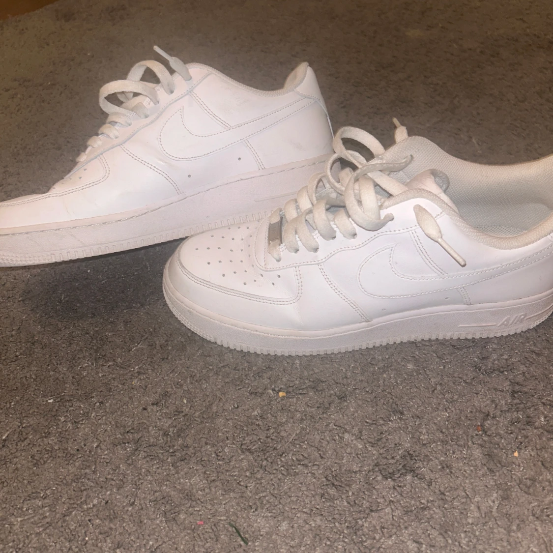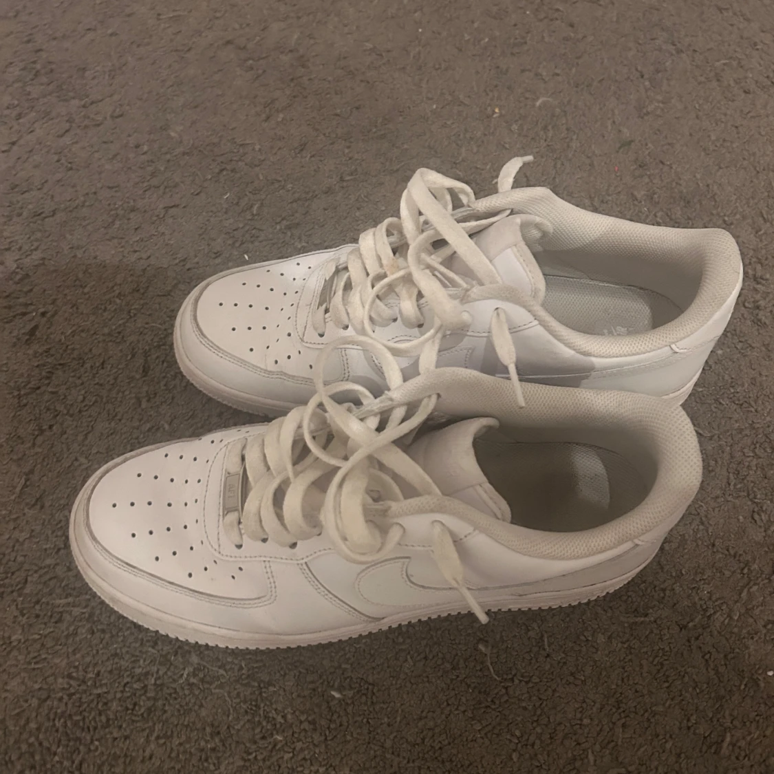 Säljer ett par klassiska vita Nike Air Force sneakers. De har en stilren design med snörning och perforerade detaljer på tån för extra ventilation. Perfekta för en avslappnad och sportig look.