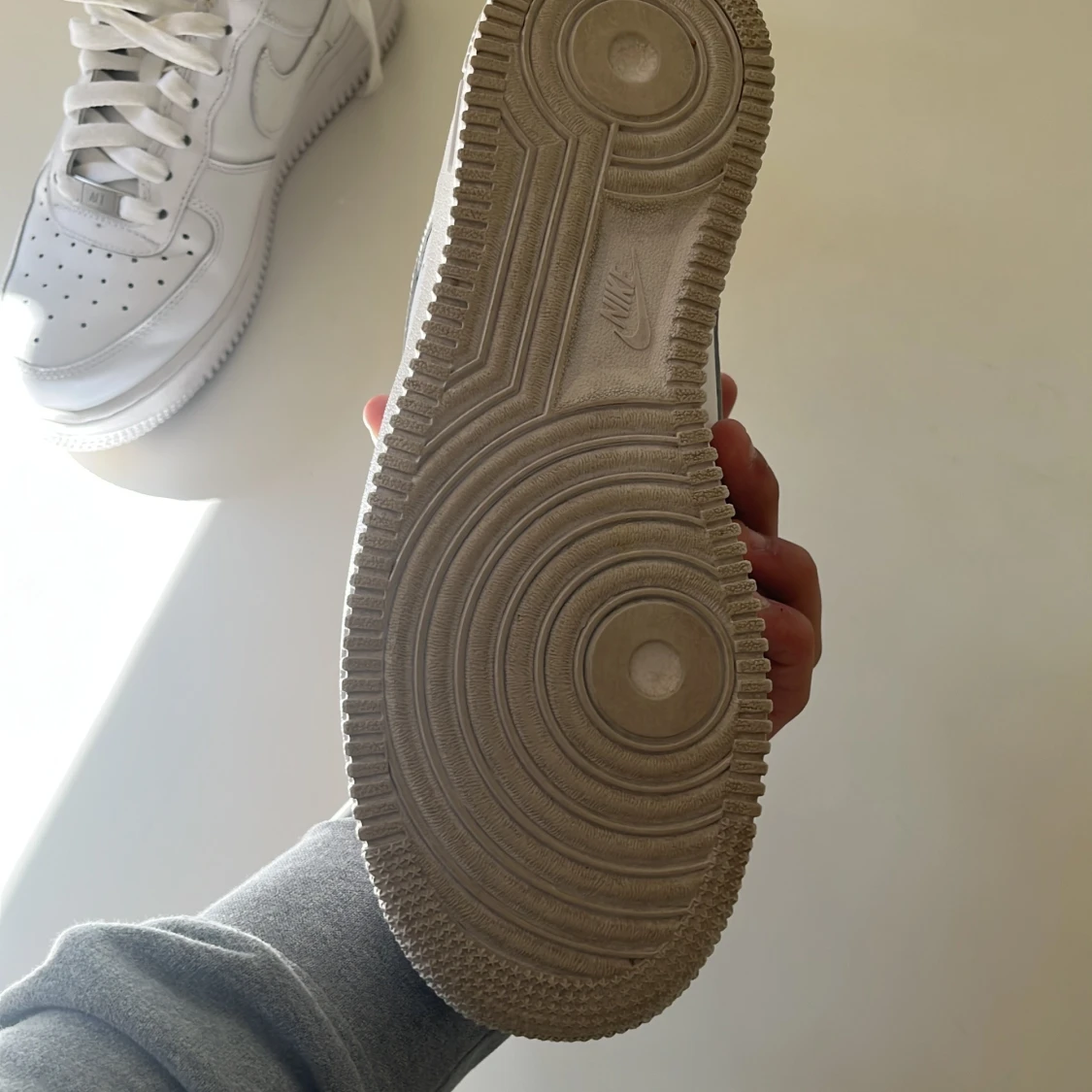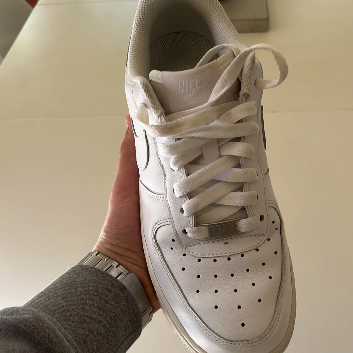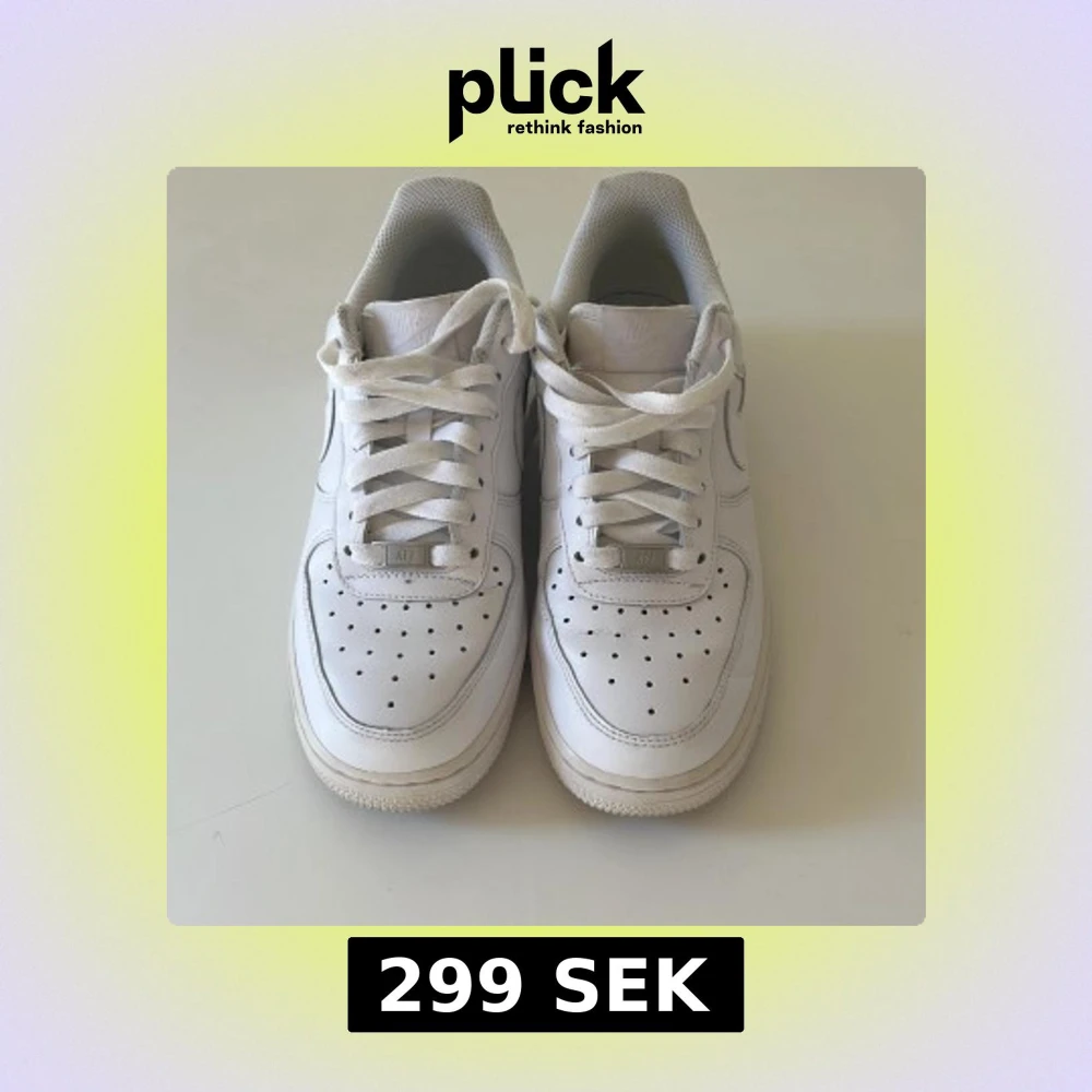 Klassiska vita Nike Air Force 1 sneakers med snörning och perforerad tå för extra ventilation. Skorna har en platt sula och är tillverkade i skinn med diskreta detaljer. Perfekta för en stilren och tidlös look. Scick 8/10 då det finns tecken på användning men inte nånting som stör priset är diskuterbart och tveka inte på att hör av er vid funderingar
