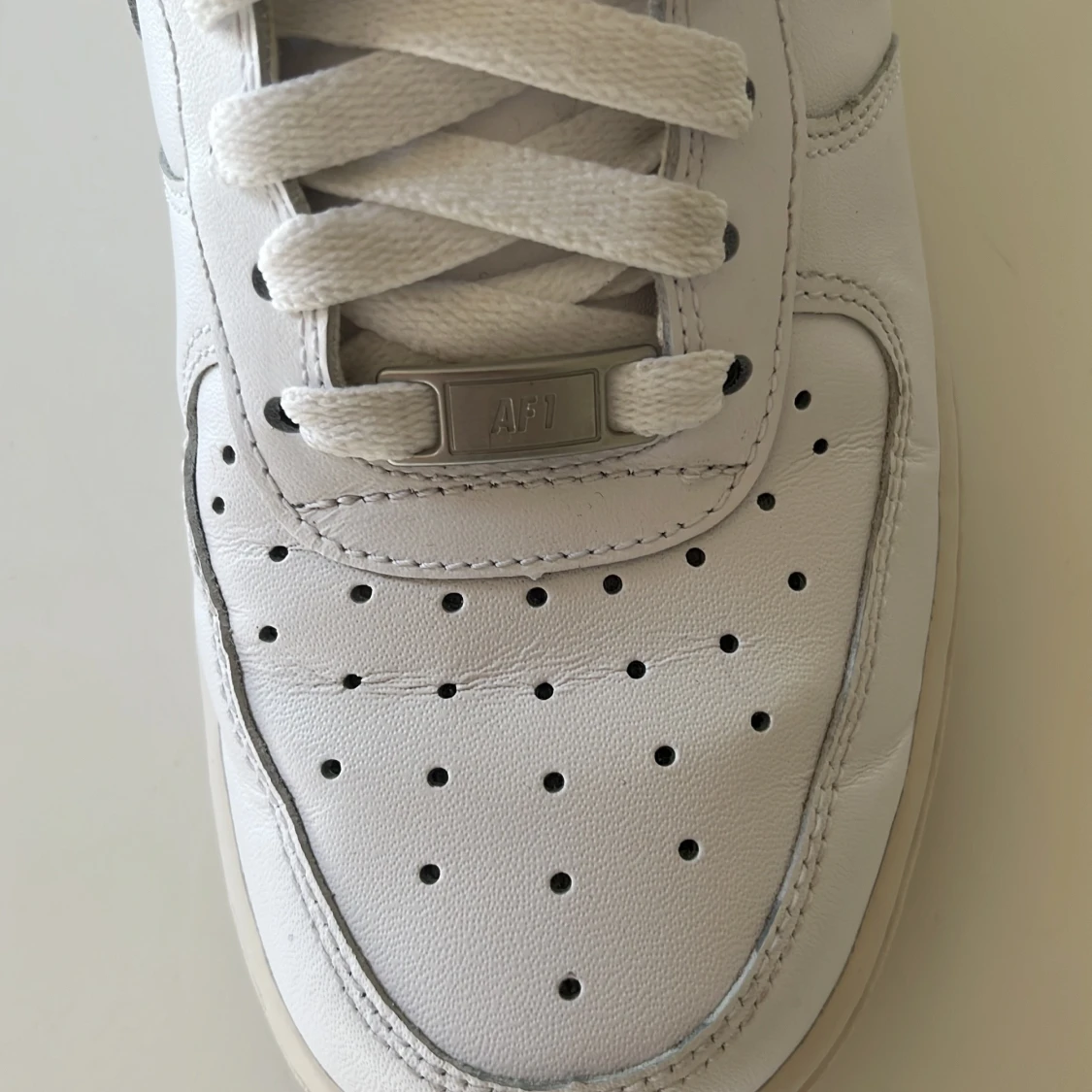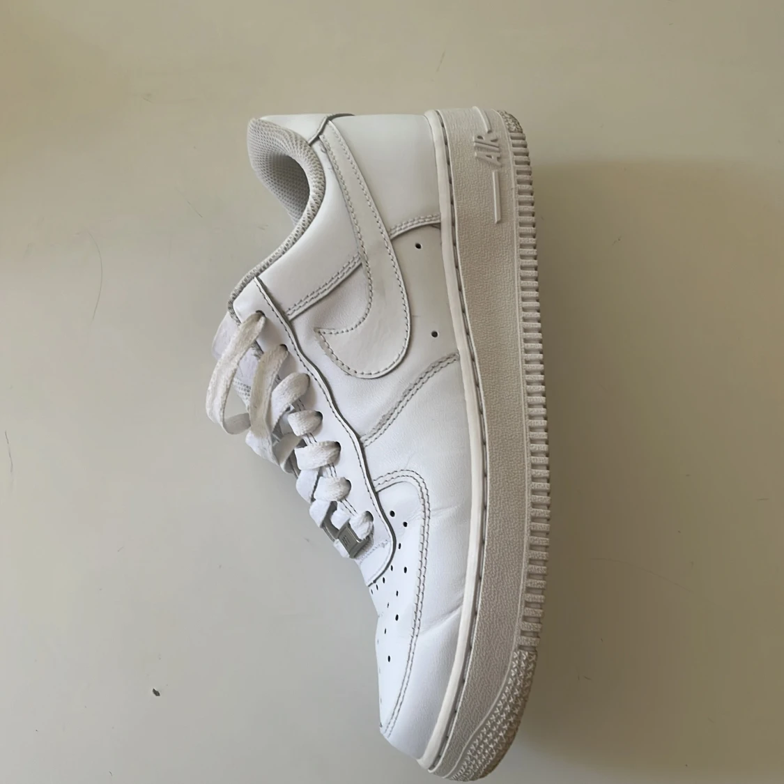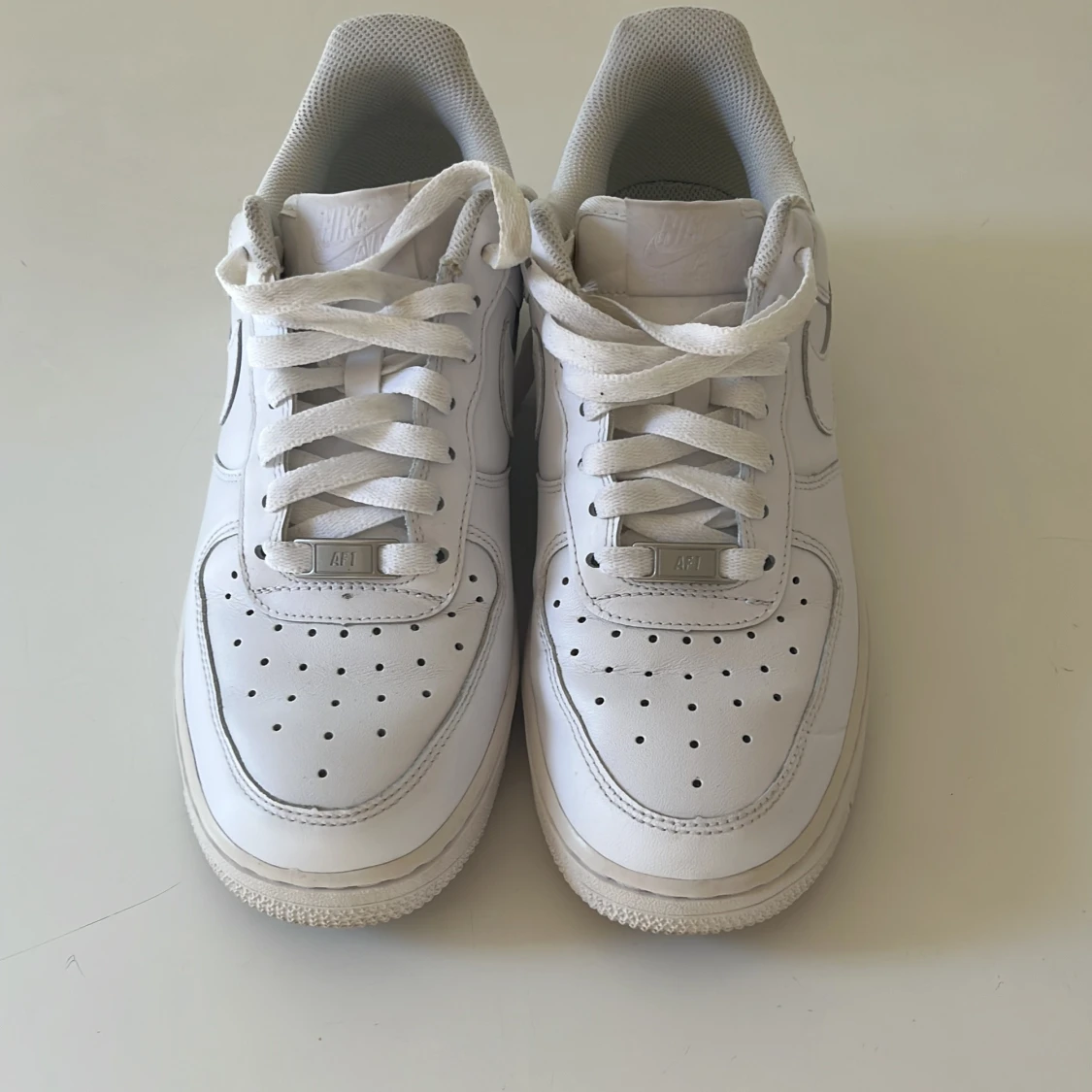 Klassiska vita Nike Air Force 1 sneakers med snörning och perforerad tå för extra ventilation. Skorna har en platt sula och är tillverkade i skinn med diskreta detaljer. Perfekta för en stilren och tidlös look. Scick 8/10 då det finns tecken på användning men inte nånting som stör priset är diskuterbart och tveka inte på att hör av er vid funderingar