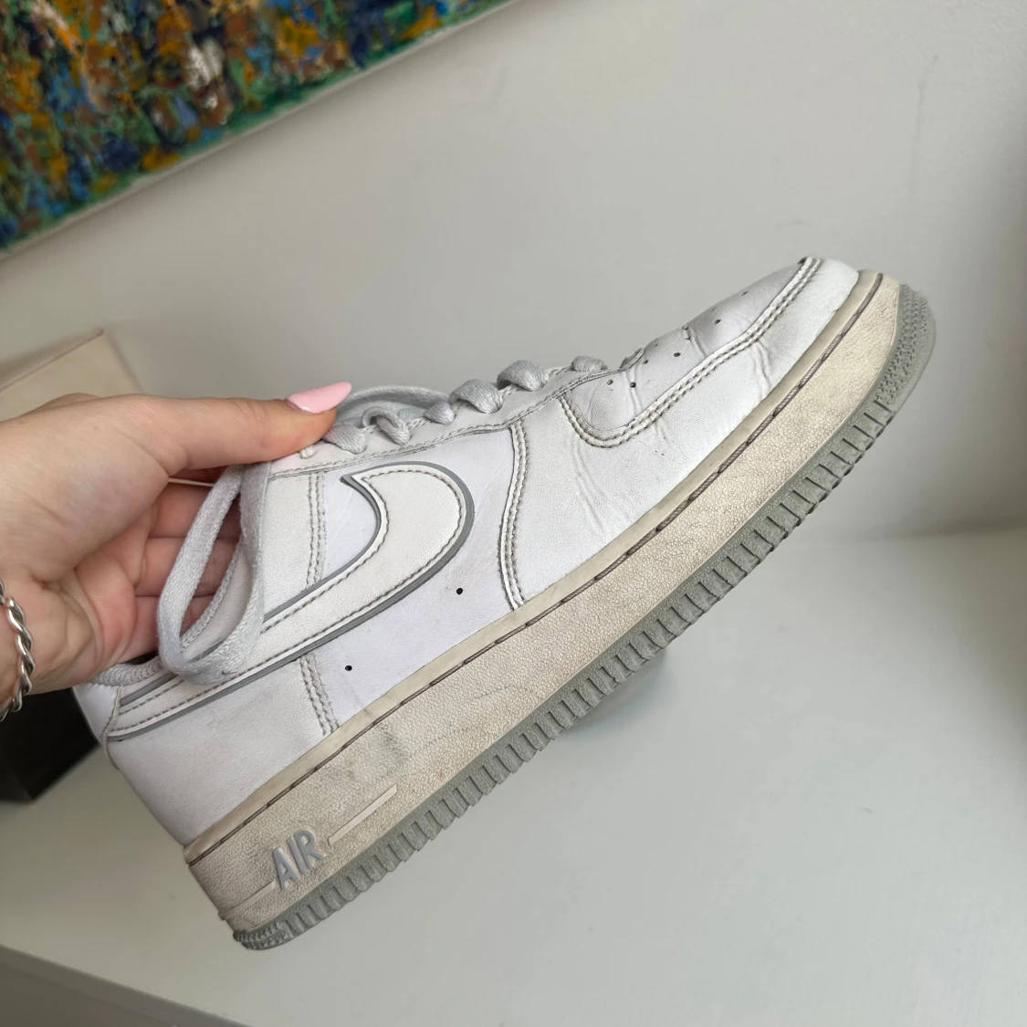 Klassiska vita Nike Air Force 1 sneakers med snörning och rund tå. Skorna har en platt sula och är tillverkade i skinn med diskreta grå detaljer. Perfekta för en stilren och sportig look.